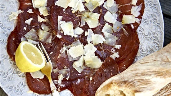 Ett klassiskt sätt att servera denna välsmakande delikatess är att lägga ut den på ett fat ringla över olivolja, pressa lite citron och toppa med rucolasallad och hyvlad grana padano.