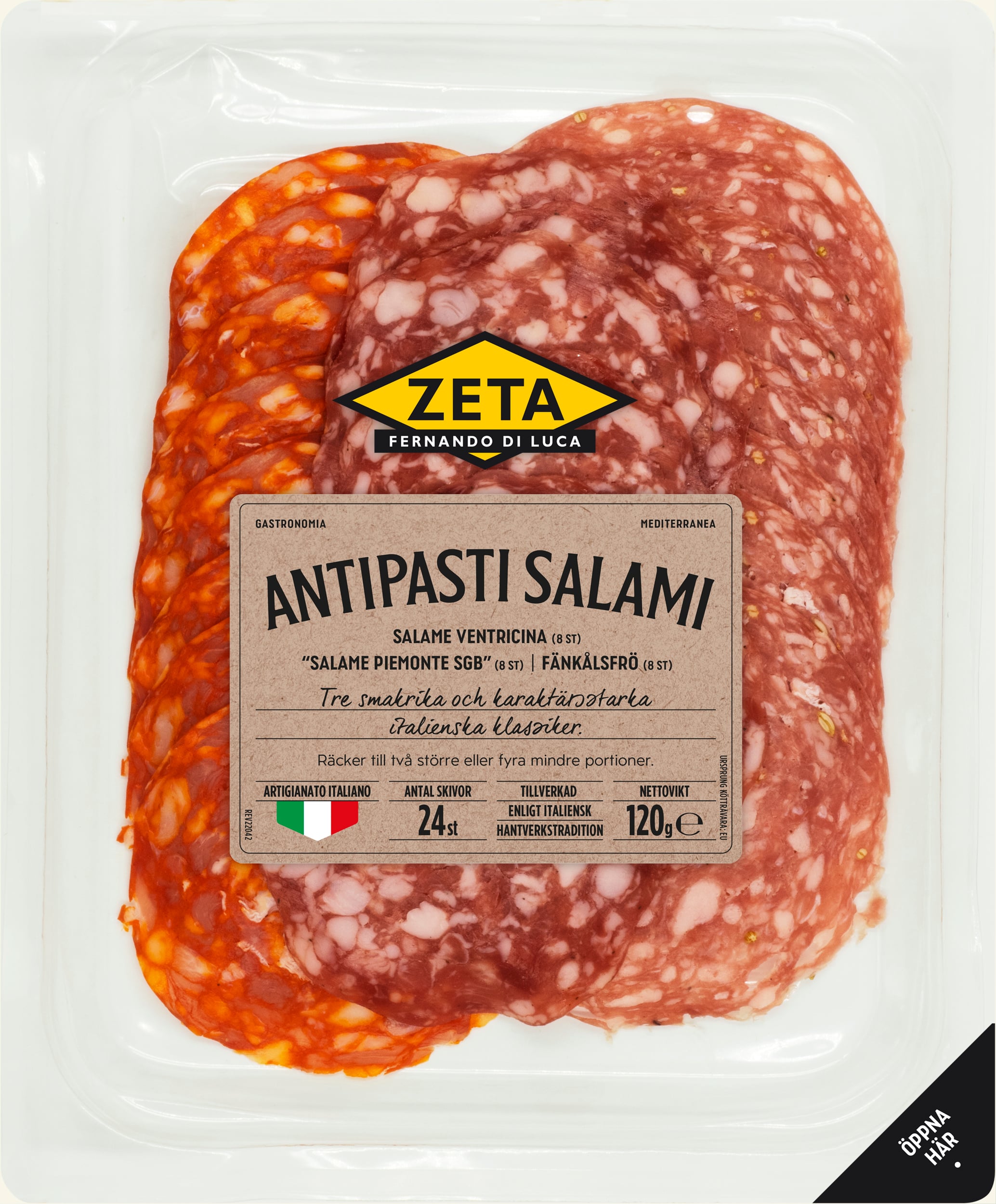 Antipastitallrik Salami – en trio av klassiska italienska salamisorter. Salame Ventricina med hetta från chili med tradition från d’Abruzzo-regionen, smakrik, aromatisk fänkålssalami med ursprung i Toscana och Salame Piemonte IGP smaksatt med regionens berömda nebbiolovin från Barolo vilket ger en pikant fyllighet. Lyxig plockmat som passar perfekt på charkbrickan, till risotton eller som apertivo.