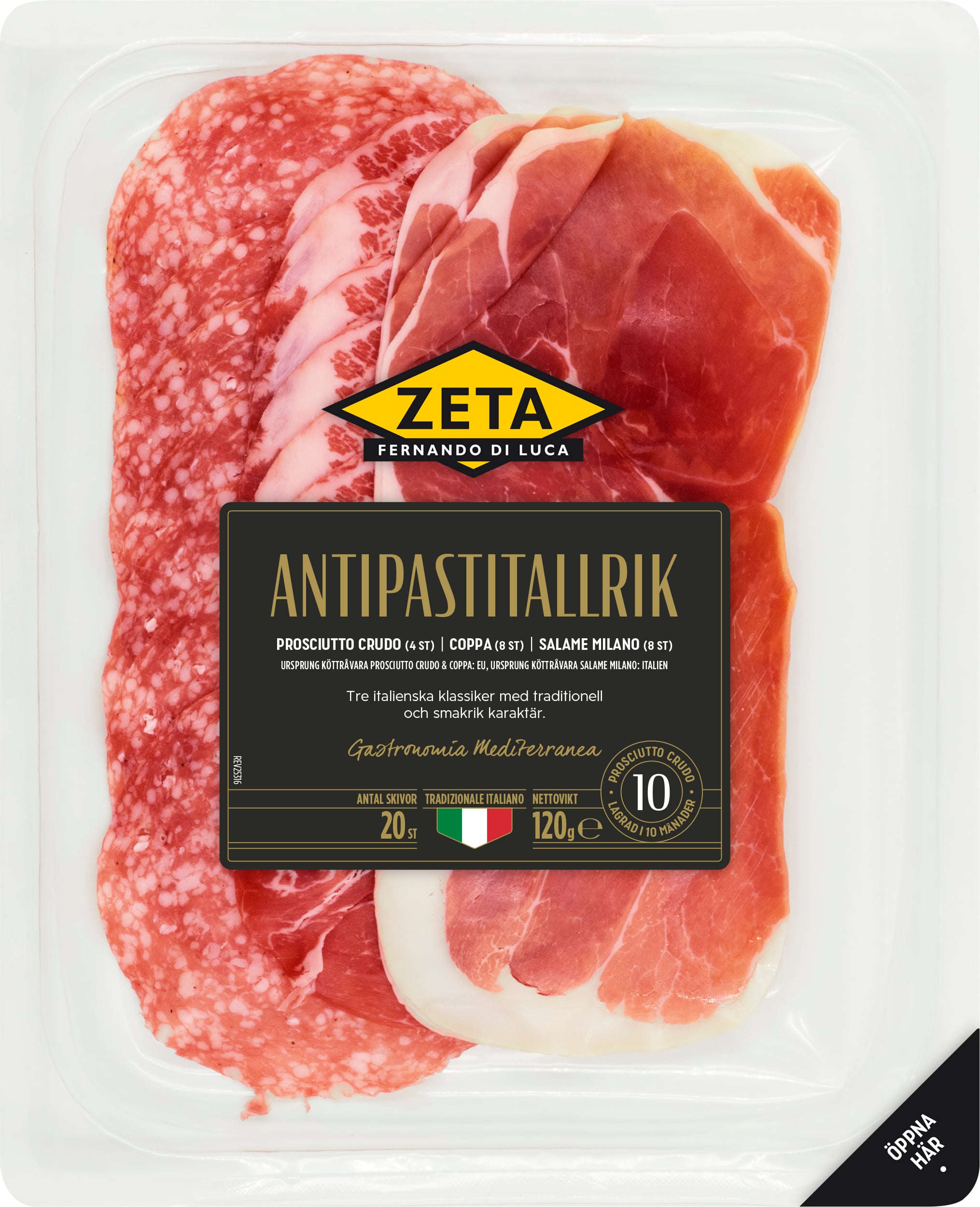 | Ingredienser | Prosciutto crudo (fläskkött*, salt). Till 100g färdig produkt har 140g kött använts). Coppa (fläskkött*, salt, dextros, naturliga aromer, antioxidationsmedel E301, konserveringsmedel E250 och E252. Till 100g färdig produkt har 125g kött använts). Salame Milano (fläskkött**, salt, dextros, sackaros, kryddor, naturliga aromer, rött vin, antioxidationsmedel E301, konserveringsmedel E252 och E250. Till 100g färdig produkt har 130g kött använts). *Uppfött och slaktat i EU. ** Uppfött och slaktat i Italien. |