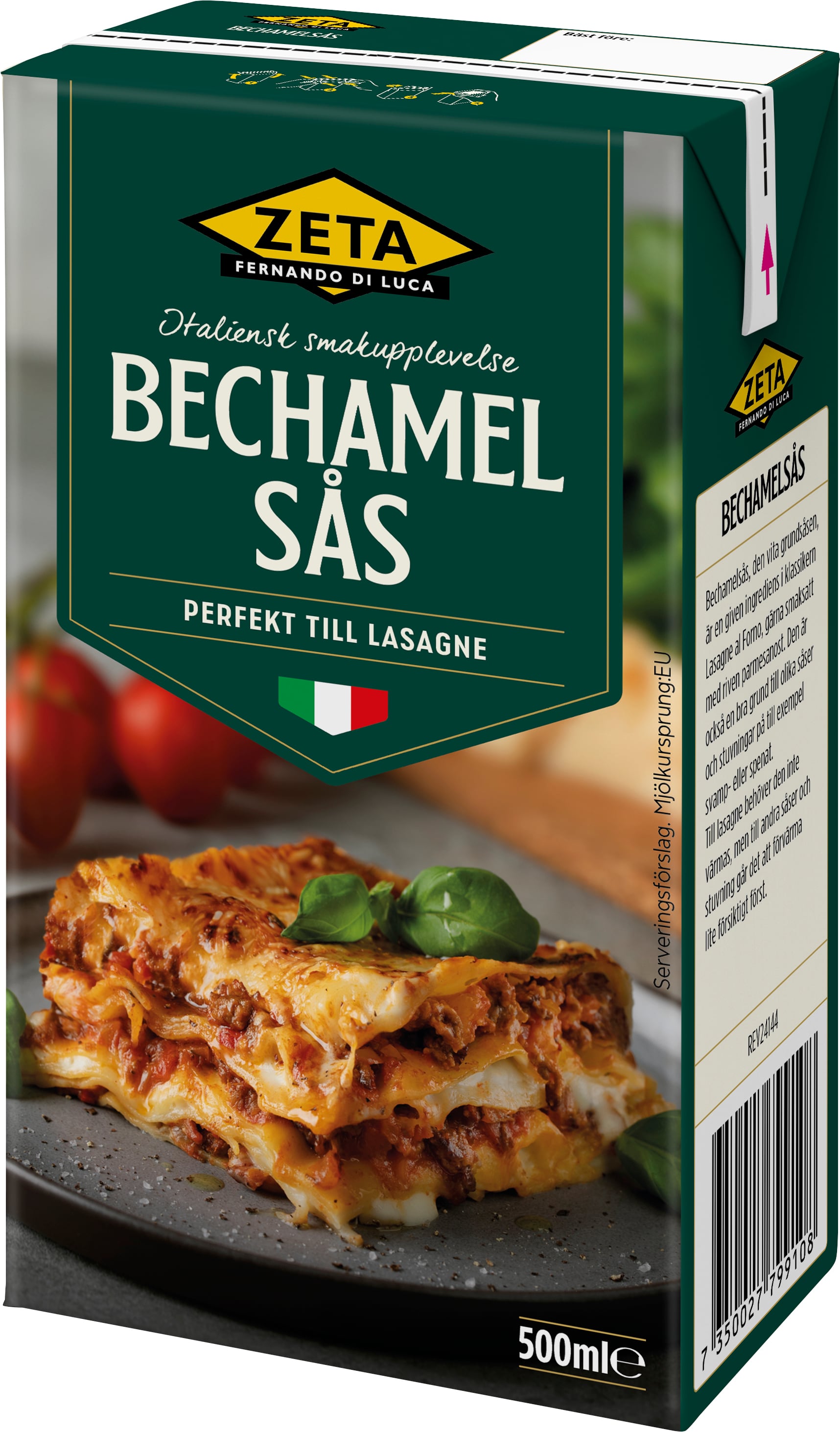 Zeta Bechamelsås är en klassisk vit grundsås. Den färdiga såsen är gjord på mjölk, grädde och vetemjöl och har en mild smak och en härligt krämig konsistens. Bechamelsås är en klassisk sås i lasagne. Såsen behöver inte värmas innan den används som lasagnefyllning. En förpackning räcker till en lasagne för 4-6 personer. Zeta Bechamelsås kan även användas som grund till andra såser såsom ostsås, svampsås eller till en gratäng.