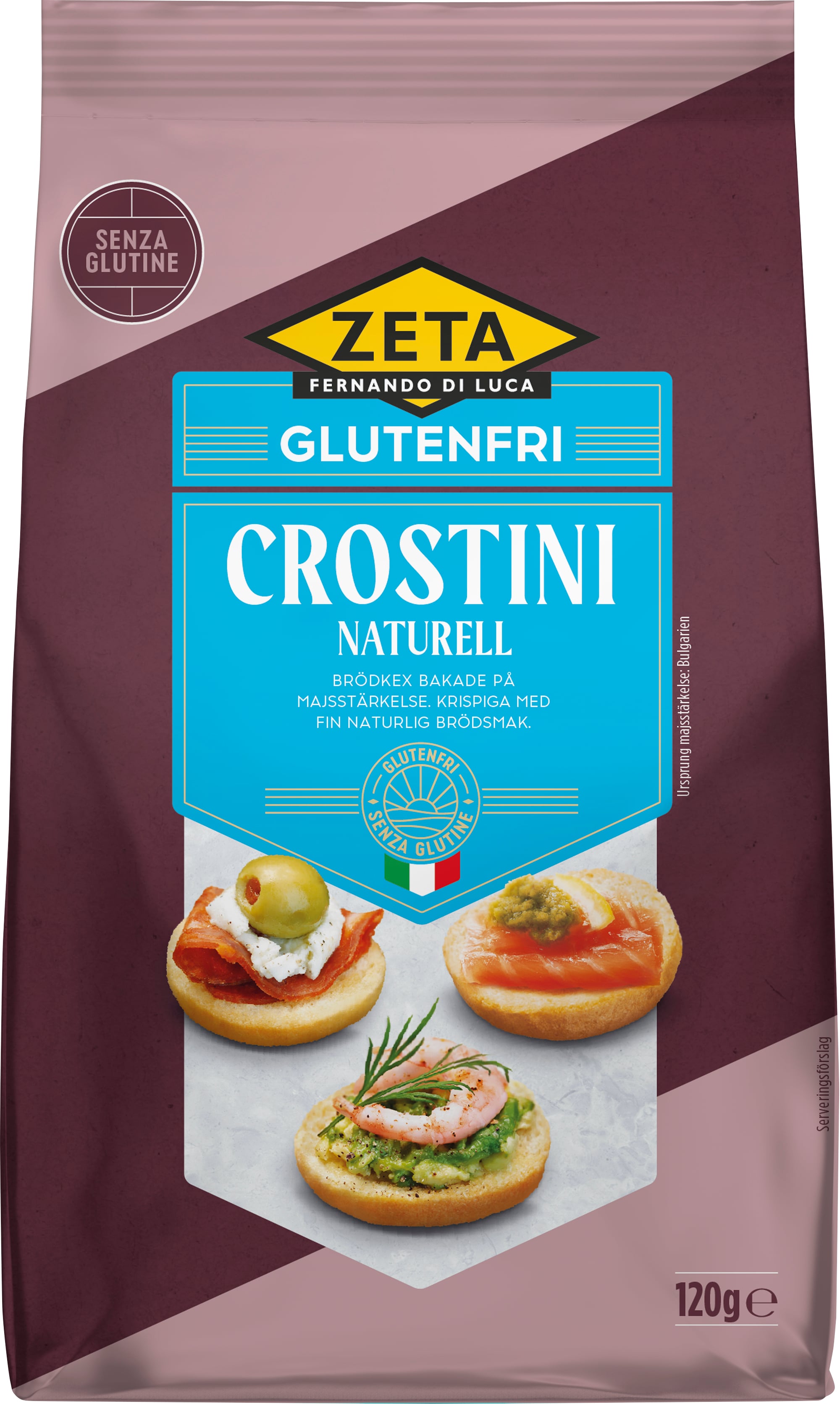 Zeta Glutenfri Crostini är krispiga brödkex bakade på majsstärkelse med en fin brödsmak. De är utmärkta på aperitivobrickan och att toppa med tapenade och andra grönsaksröror. Men även med charkuterier, ost och skaldjur. Traditionen med crostini härstammar från medeltiden när bröd ofta fick vara tallriken som maten serverades på.