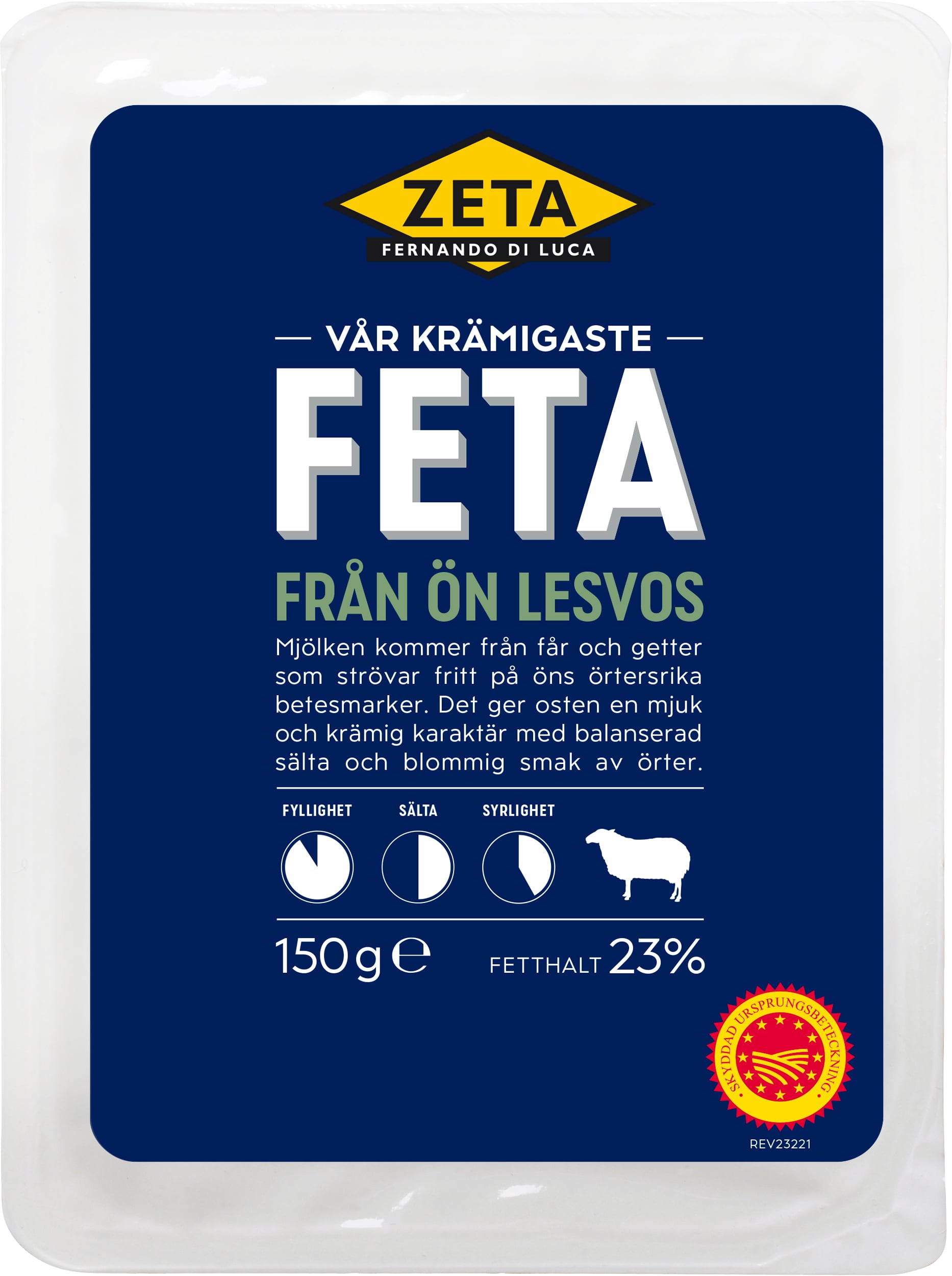 Zeta Feta från ön Lesvos är en grekisk ursprungsskyddad ost gjord på pastöriserad mjölk från Lesvos vars örtrika betesmarker ger mjölken blommig smak av örter. Krämig och fruktig ost med balanserad syra och mjuk sälta. Lagras med havssalt för smakens skull. Passar till varm och kall matlagning – precis som den är med lite olivolja och några skivor solmogen tomat, i sallader, smulad över gryta eller ugnsbakade grönsaker. Fetaost som blir över går att frysa.