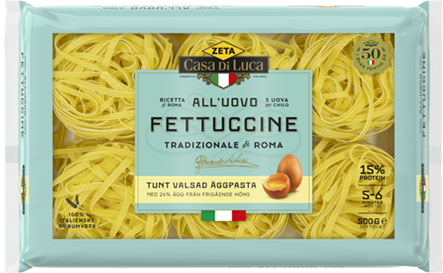 Fettuccine är en klassisk italiensk bandpasta bakad på ägg och durumvete och den har sitt ursprung i det toskanska och romerska köket. Fettuccine betyder små band. Pastadegen innehåller hela 5 ägg per kilo mjöl vilket ger en smidig deg som kan kavlas tunt. Äggen ger även en extra god smak samt en lite högre proteinhalt och därmed ett bra tuggmotstånd, al dente. Fettucine serveras gärna med en sås med bitar gjord på kött, kyckling eller grönsaker.