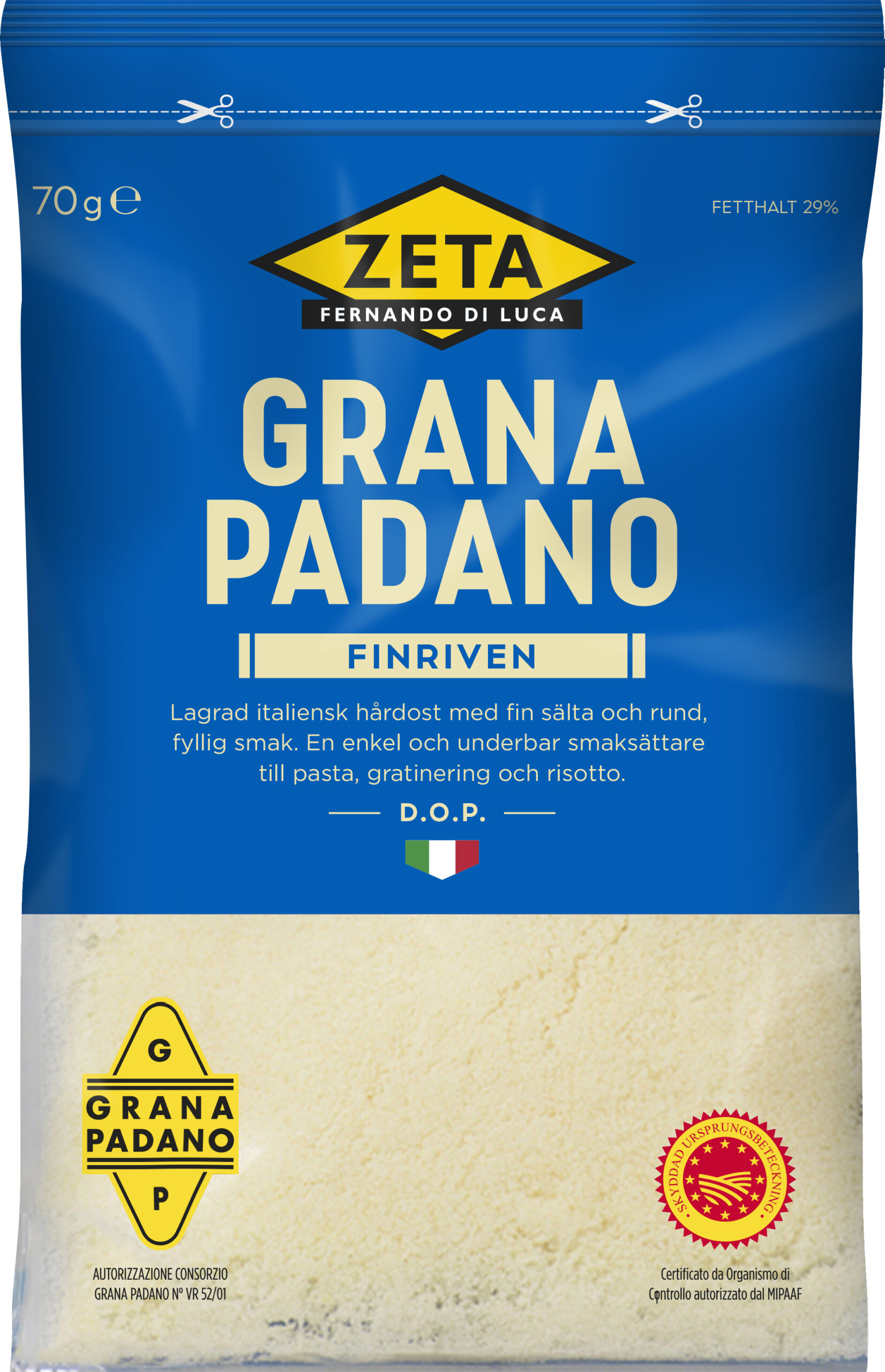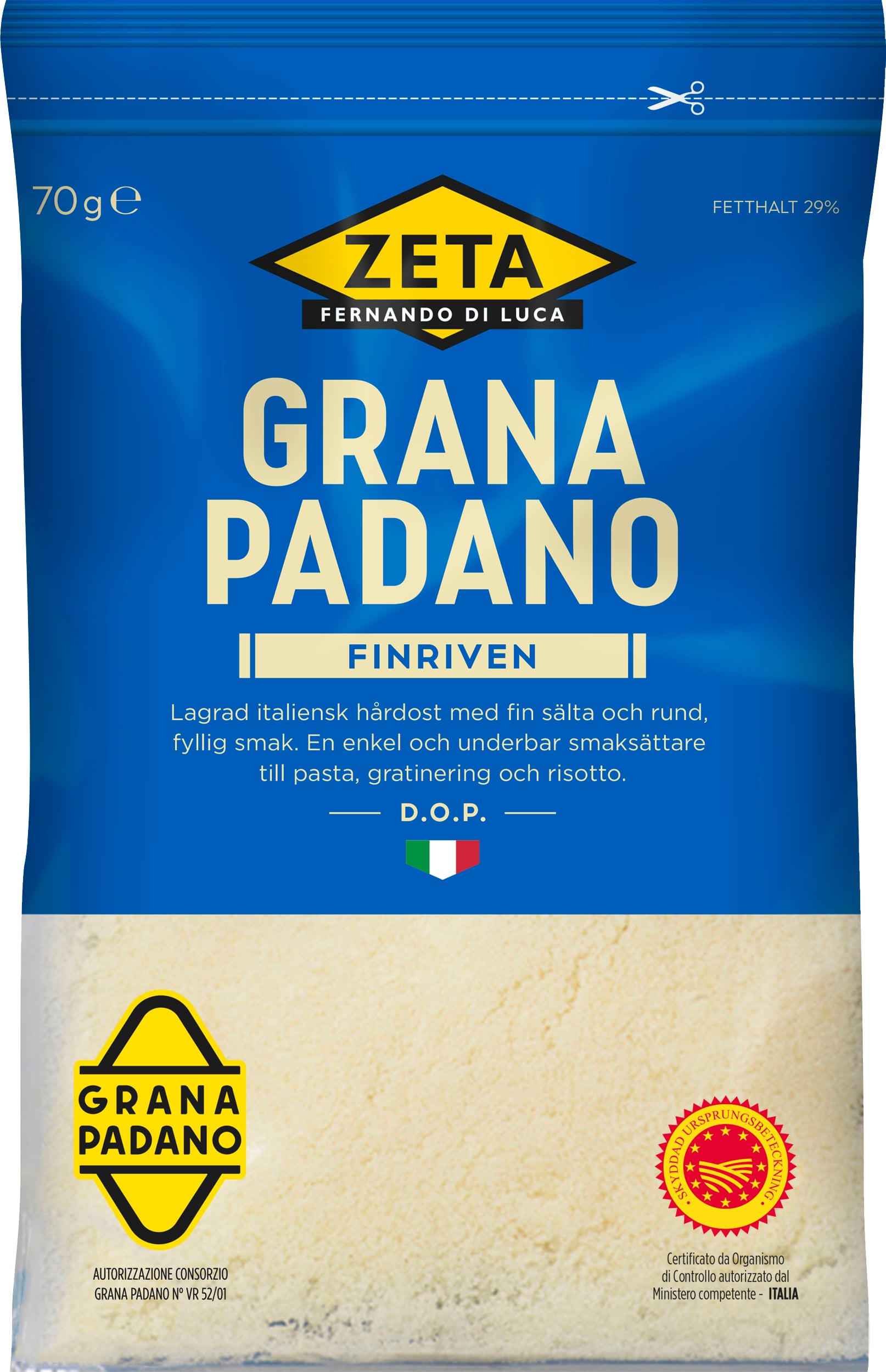 Zeta Grana Padano finriven är en lagrad ursprungsskyddad hårdost från norra Italien med fin sälta och rund, fyllig smak. Lagrad i minst 9 månader som anses vara kort tid när det kommer till Grana Padano. Det innebär att osten är relativt mjuk med fina smältegenskaper. Passar till pastasåser och gratinering av allt från grönsaker, soppor, smörgåsar, lasagne och pastagratänger.