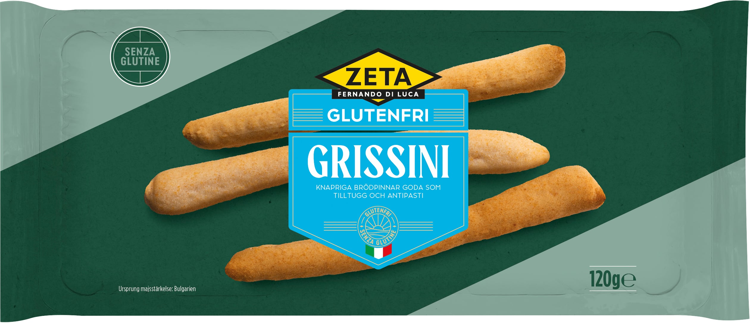 Zeta Glutenfria Grissini är brödpinnar, bakade på majsstärkelse, majsmjöl och solrosolja bland annat. De är en lite tjockare typ av grissini, är krispiga och har en fin brödig smak. Passar som tillbehör till soppor, sallader och på aperitivobrickan. Traditionen att äta grissini uppstod i Turin under 1500-talet.