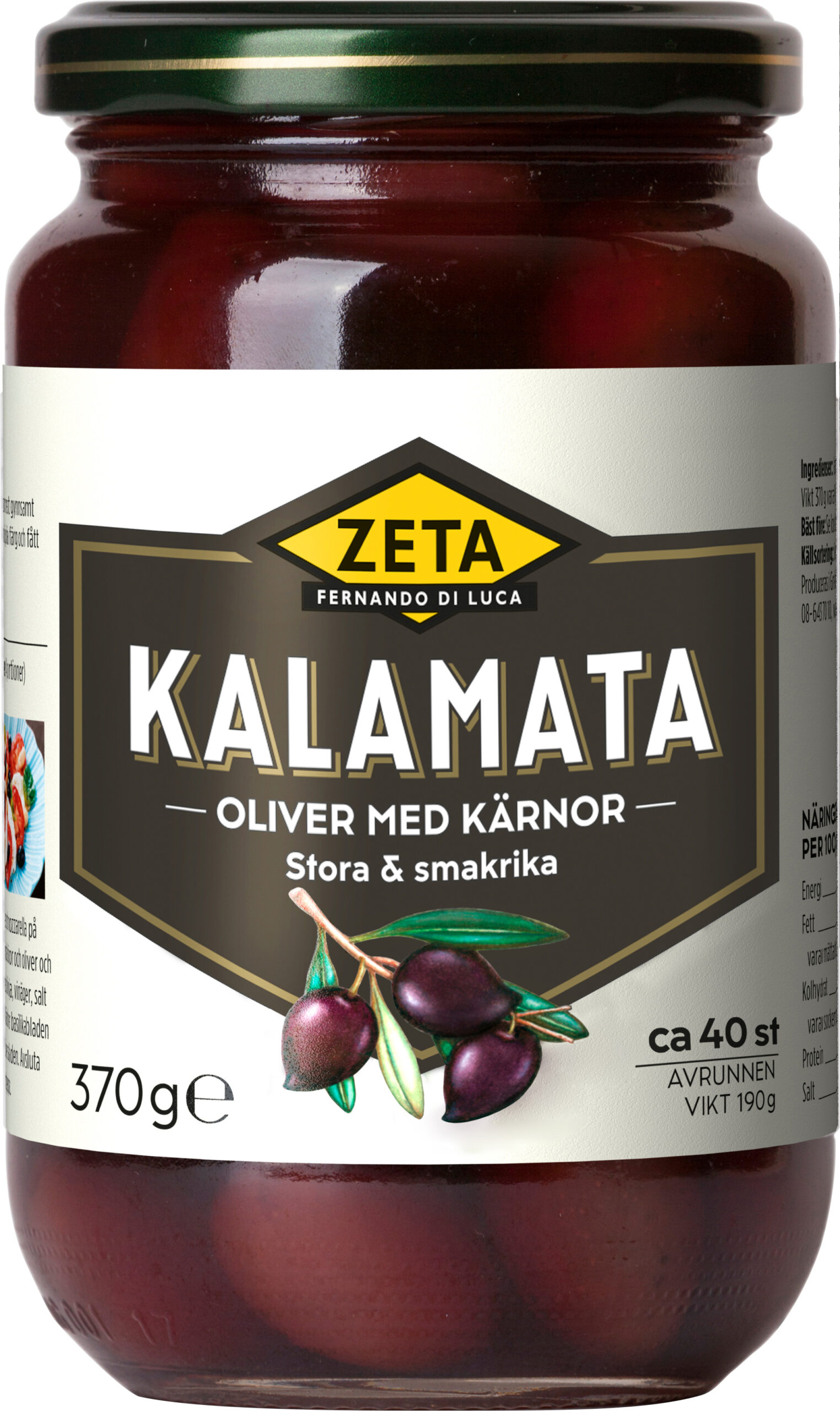 Zeta Kalamataoliver är oliver från den grekiska provinsen Messenien där Kalamata är huvudstad. De skördas från mitten av oktober till mitten av november då de mognat och fått sina djupa, mörka färg. Smaken har rundats av till en fruktig, nötig och balanserad upplevelse med en mild beska i eftersmaken. Använd oliver med kärna som tilltugg eller tillbehör till antipasti eller aperitivo.
