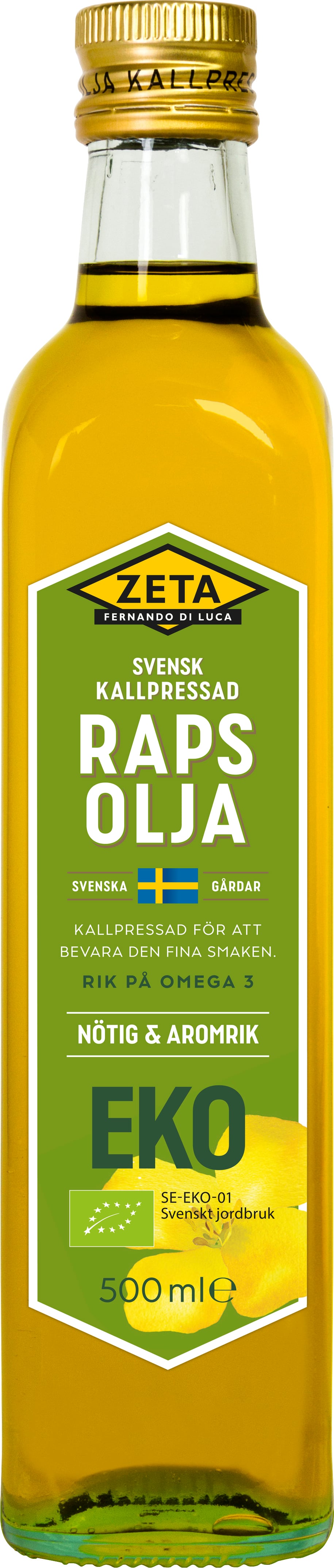 Rapsolja bär smak av det landskap där rapsen växer. Så bra som betingelserna är, så god bli oljan. All arom och god smak är sakta frampressad, droppe för droppe, ur frön från gyllengula fält kring välskötta gårdar. Zetas svenska ekologiska kallpressade rapsolja är mjuk och fin med en något fyllig karaktär och nötig smak. Denna rapsolja passar bra till både varm och kall matlagning, till exempel i dressing och såser. Rapsolja är rik på omega-3.