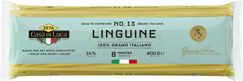Casa Di Luca Linguine är tillverkad av 100% italienskt durumvete, enligt gammal tradition. Den är mycket lättare att koka perfekt ”al dente” och behåller det rätta tuggmotståndet genom hela måltiden utan att bli klibbig. Pastasorten Linguine kommer från regionen Ligurien i nordvästra Italien, med Genova som huvudstad. I Ligurien serveras alltid Pesto Genovese med Linguine. Zeta Linguine är utmärkt även med tomatsåser, olivolja eller skaldjurssåser.