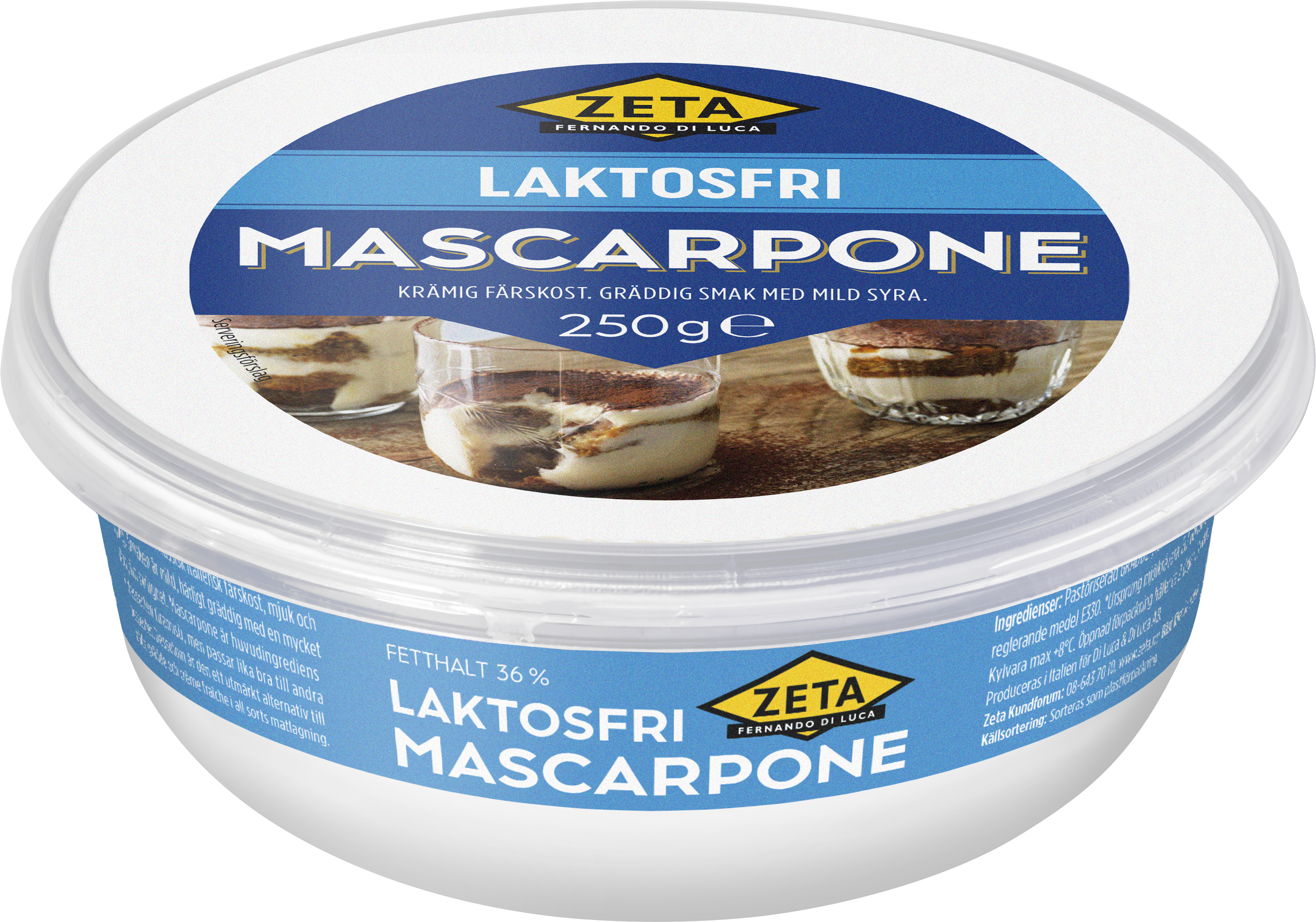 Zeta Laktosfri Mascarpone är en klassisk italiensk färskost. Smaken är mild, härligt gräddig med en mycket lätt, fin syrlighet. Mascarpone är huvudingrediens i desserten tiramisù, men passar lika bra till andra desserter. Några skedar Mascarpone gör pastan läckert krämig. Den är också härligt god till dressingar, såser, färsk frukt och bakverk. Mascarpone utan laktos är en anpassning så att fler kan njuta av den fantastiska smaken.