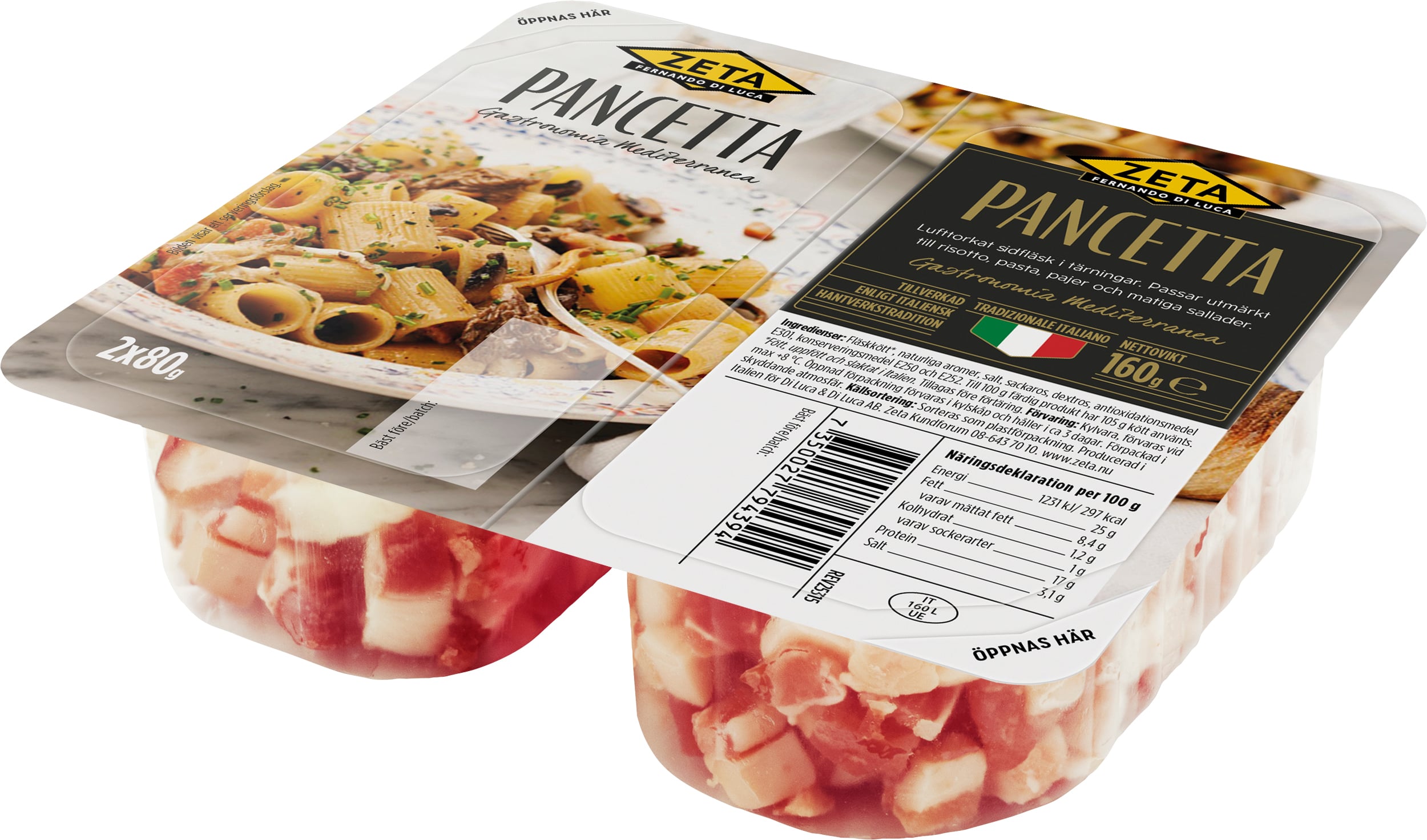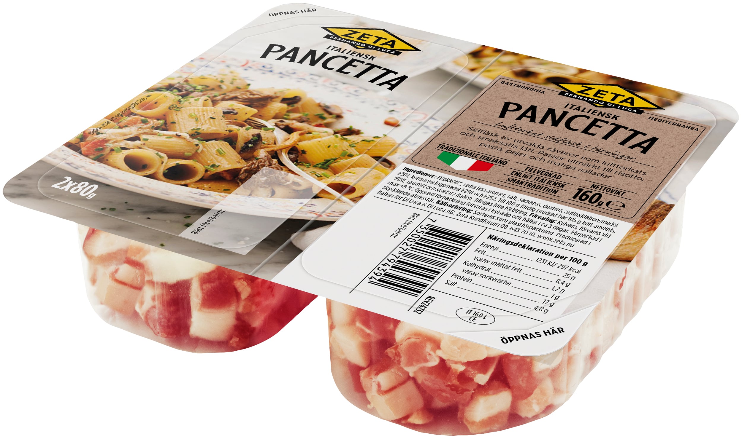 Italienskt lufttorkat sidfläsk i små tärningar tillverkat enligt gammal hantverkstradition. Smaken är aromatisk av fina örtkryddor. Pancetta steks i lite olivolja för bästa resultat och används i klassiska pastarätter som amatriciana och carbonara men även i sallader, soppor, pajer och grytor.