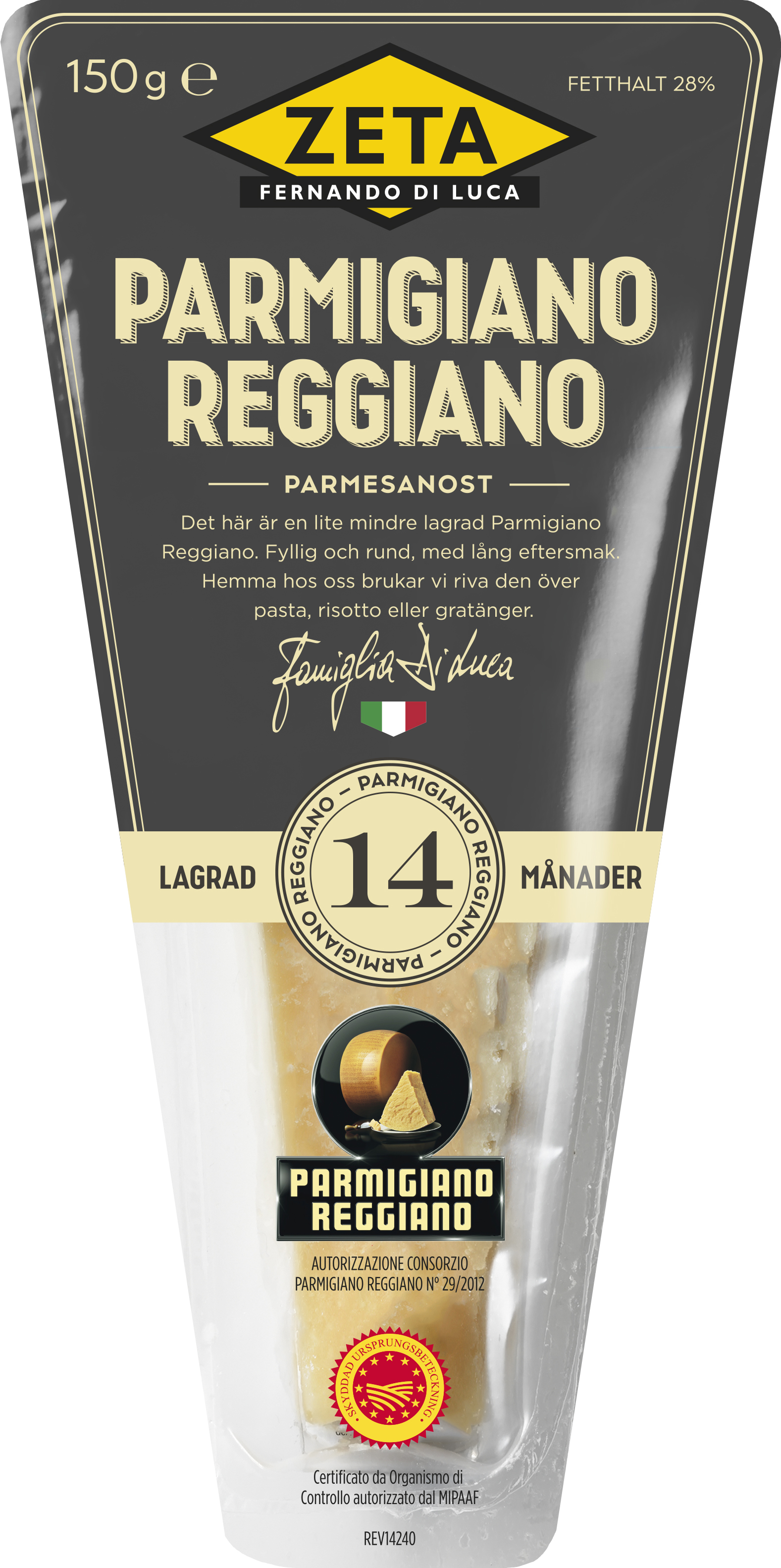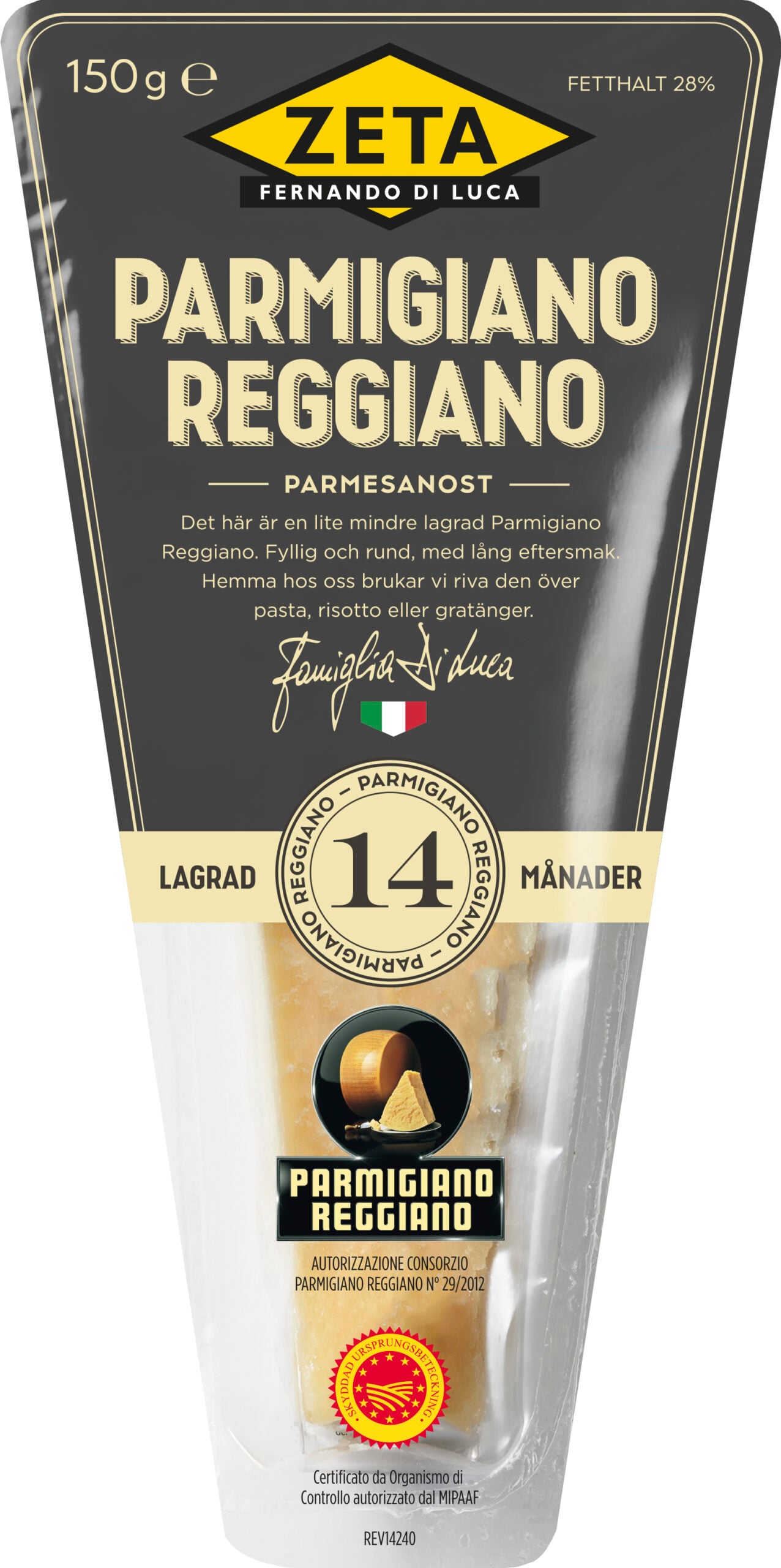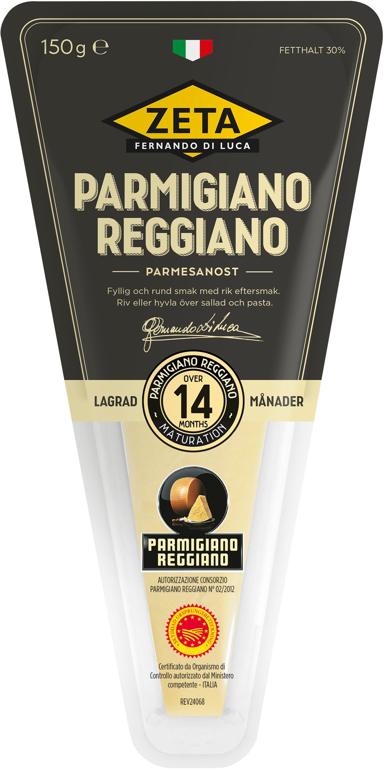 Zeta Parmigiano Reggiano är en traditionell ursprungsskyddad hårdost från norra Italien med fyllig, rund smak. Självklar riven över pastarätter och på antipastibrickan. Oslagbar i risotto eller att äta som den är med en droppe balsamvinäger. Lagrad i 14 månader som innebär att osten är relativt mjuk med fina smältegenskaper. Passar till gratinering, mångsidig som umamirik smaksättare, gärna i en soppa, sås, sallad eller paj. Släng inte kanten! Det är ost ända ut.