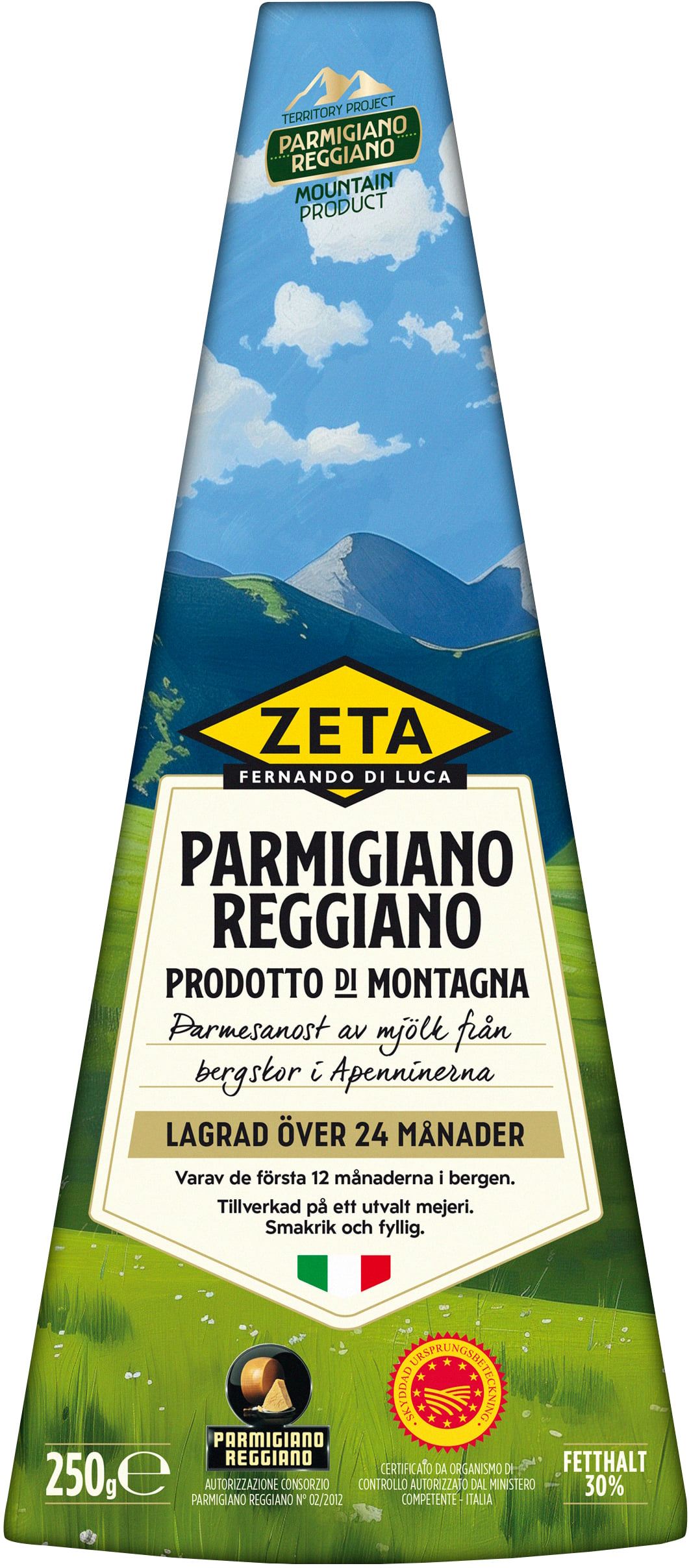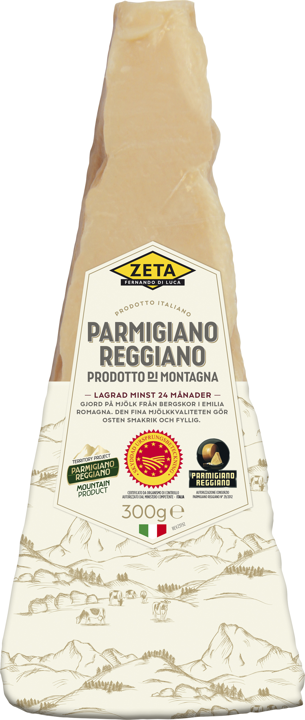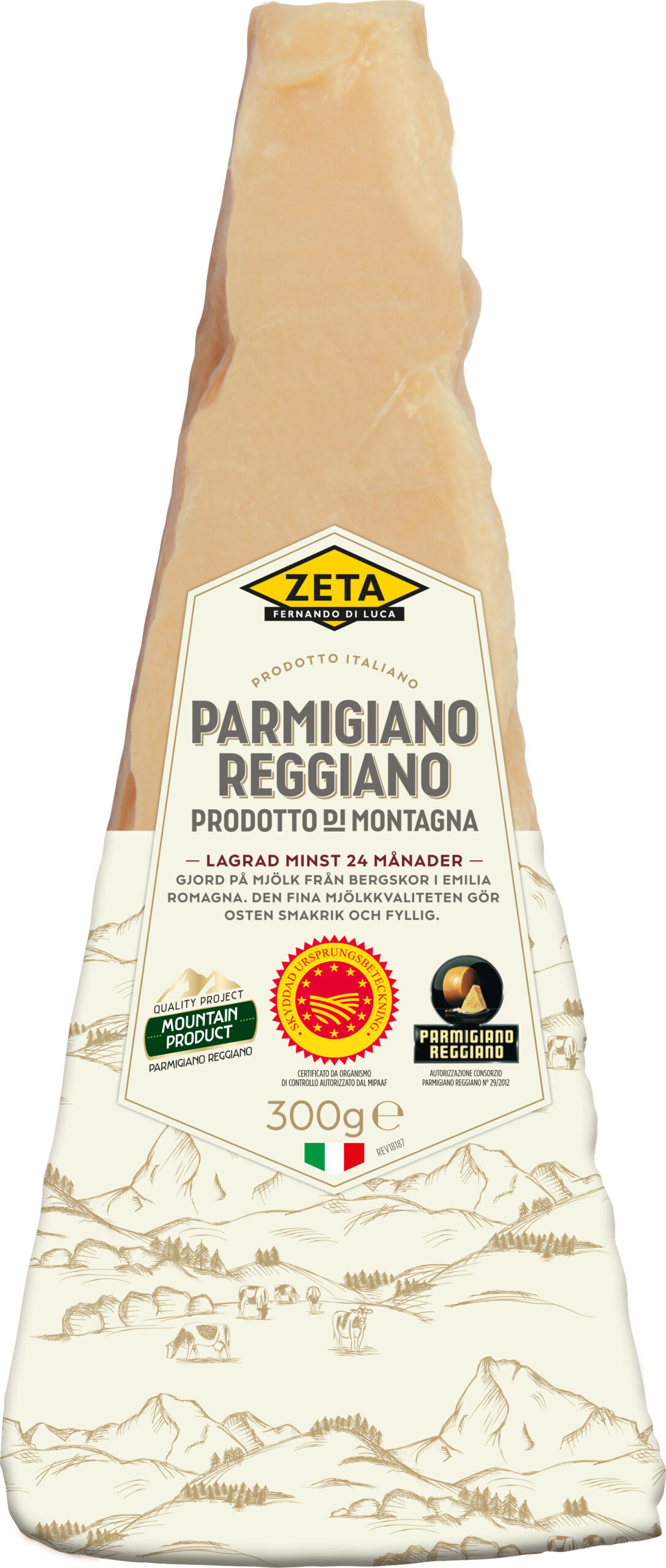 Zeta Parmigiano Reggiano di Montagna är en hårdost gjord på mjölk från bergskor. Korna betar gräs och örter vilket ger hög mjölkkvalitet och extra smakrik fyllig ost. Självklar över pastarätter! Passar på ostbrick med fikonmarmelad eller Crema di Balsamico. Bryt gärna osten i mindre bitar och ha som tilltugg före maten, en härlig aptitretare! Lagrad i minst 24 månader. Släng inte kanten det är ost ända ut. Koka med kanten som umamirik smaksättare.