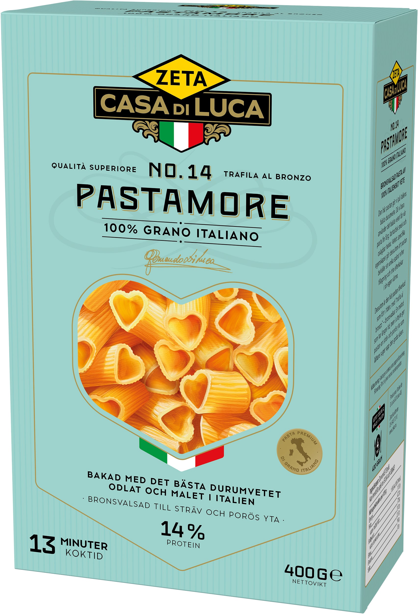 Zeta Pastamore är en hjärtformad rörpasta. Pastan är bakad på ett italienskt durumvete med hela 14 procents proteinhalt. Det ger fina kokegenskaper och gör att pastan behåller al dente-känslan genom hela måltiden. Den är tillverkad av valsar som ger en porös, lite ojämn yta vilket gör att såsen och smakerna absorberas bättre. Pastan är varsamt torkad under lång tid vilket gör att den inte spricker vid kokning. Passar utmärkt till fylliga såser.