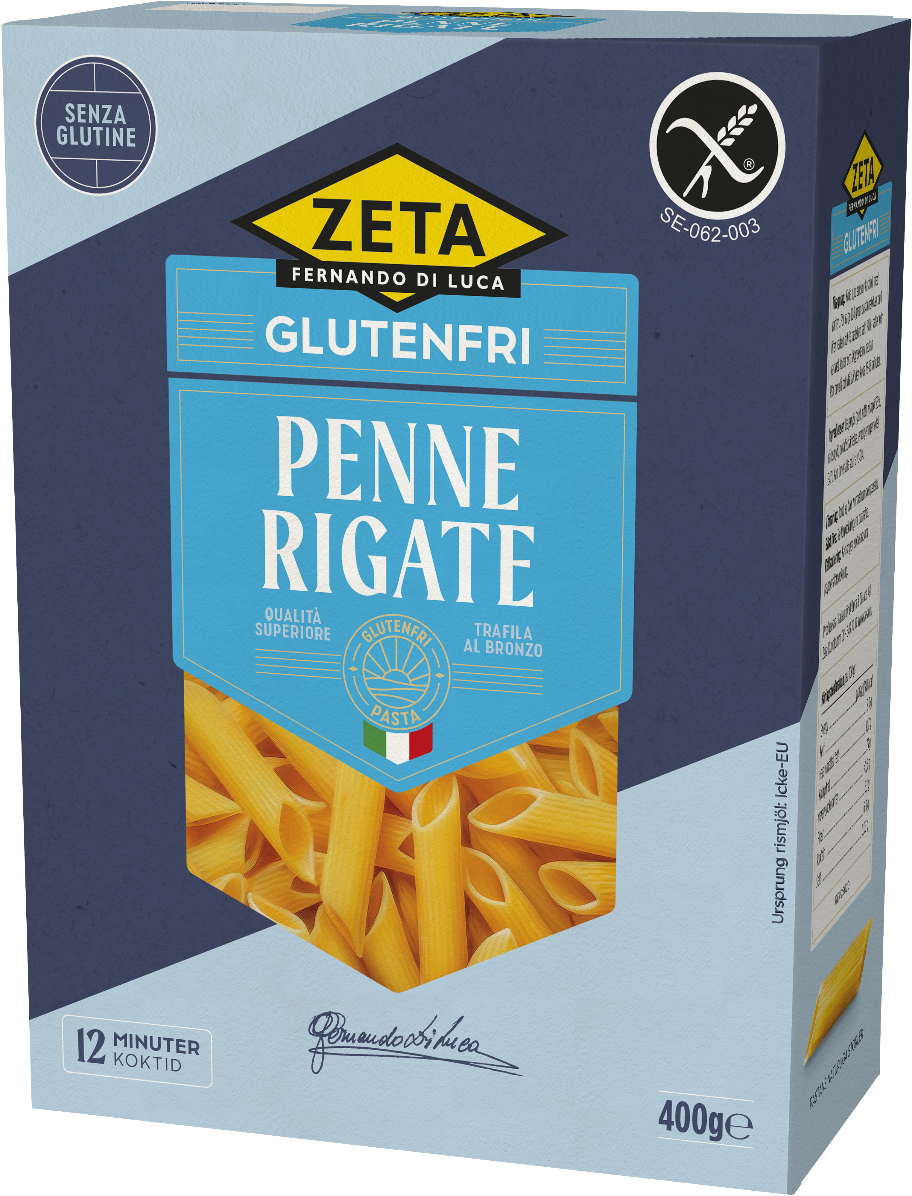 Zeta Glutenfri Penne Rigate är pasta bakad på mjöl av råris och vitt ris, majsmjöl och potatisstärkelse. Pastan är valsad till ojämn yta så att smakerna absorberas bättre. Glutenfri Penne Rigate smakar väldigt likt vanlig pasta och har fina kokegenskaper, kokar inte sönder och har bra al dente-känsla. Den passar väldigt bra ihop med finfördelade såser med små bitar som kan smita in i röret. Penne betyder fjäderpenna och rigate beskriver att den är räfflad.
