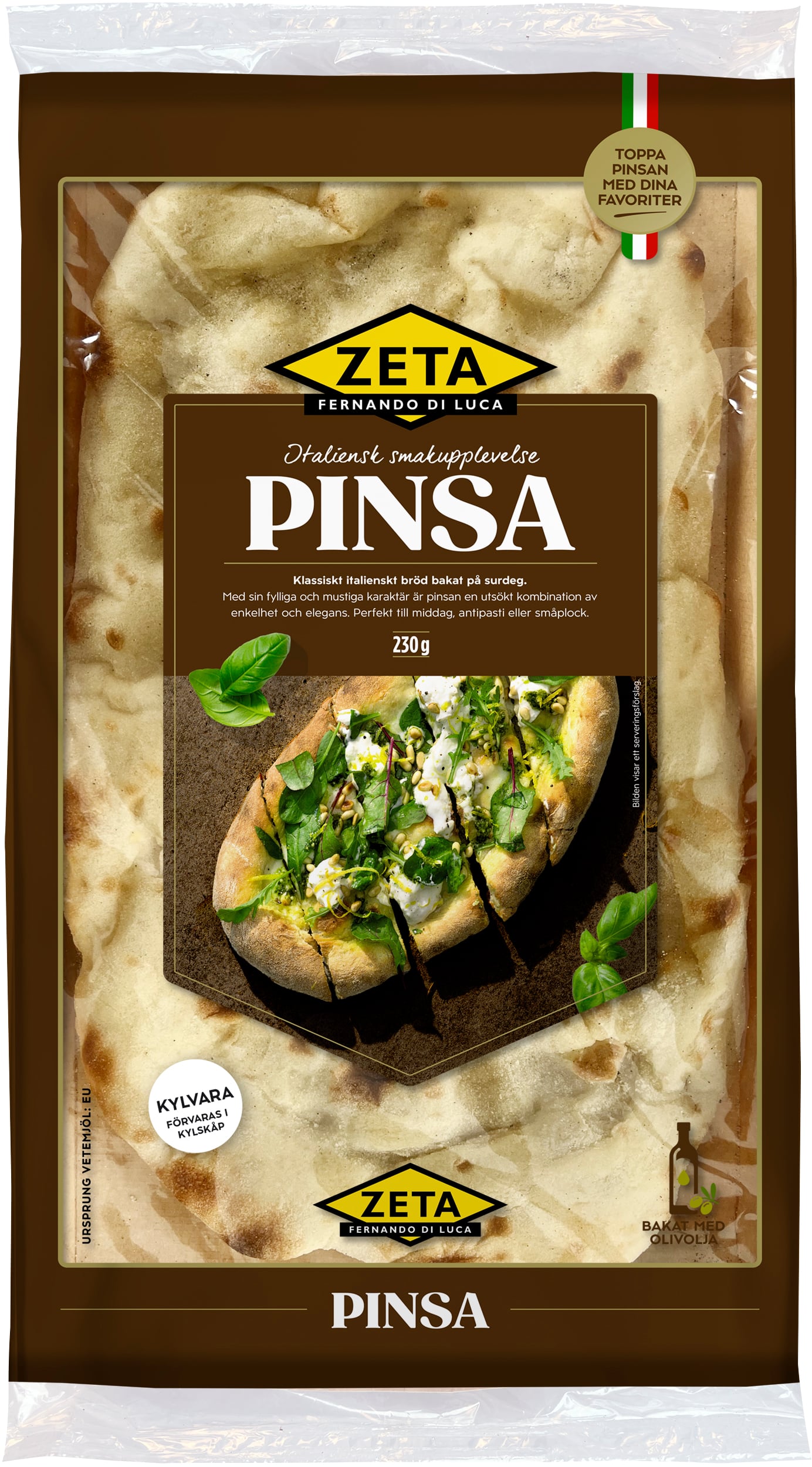 | Tillagning | 1.Sätt ugnen på 250 grader (230 grader för tillagning i tråg). 2. Lyft pinsan ur papperstråget och lägg på plåt. 3. Toppa med mozzarella och riven parmesan. 4. Grädda i 5-7 min eller tills osten smält och brödet fått fin färg. 5. Toppa med delikatesser tex pesto, lufttorkad skinka och örter. 6. Ringla över god olivolja innan servering. |