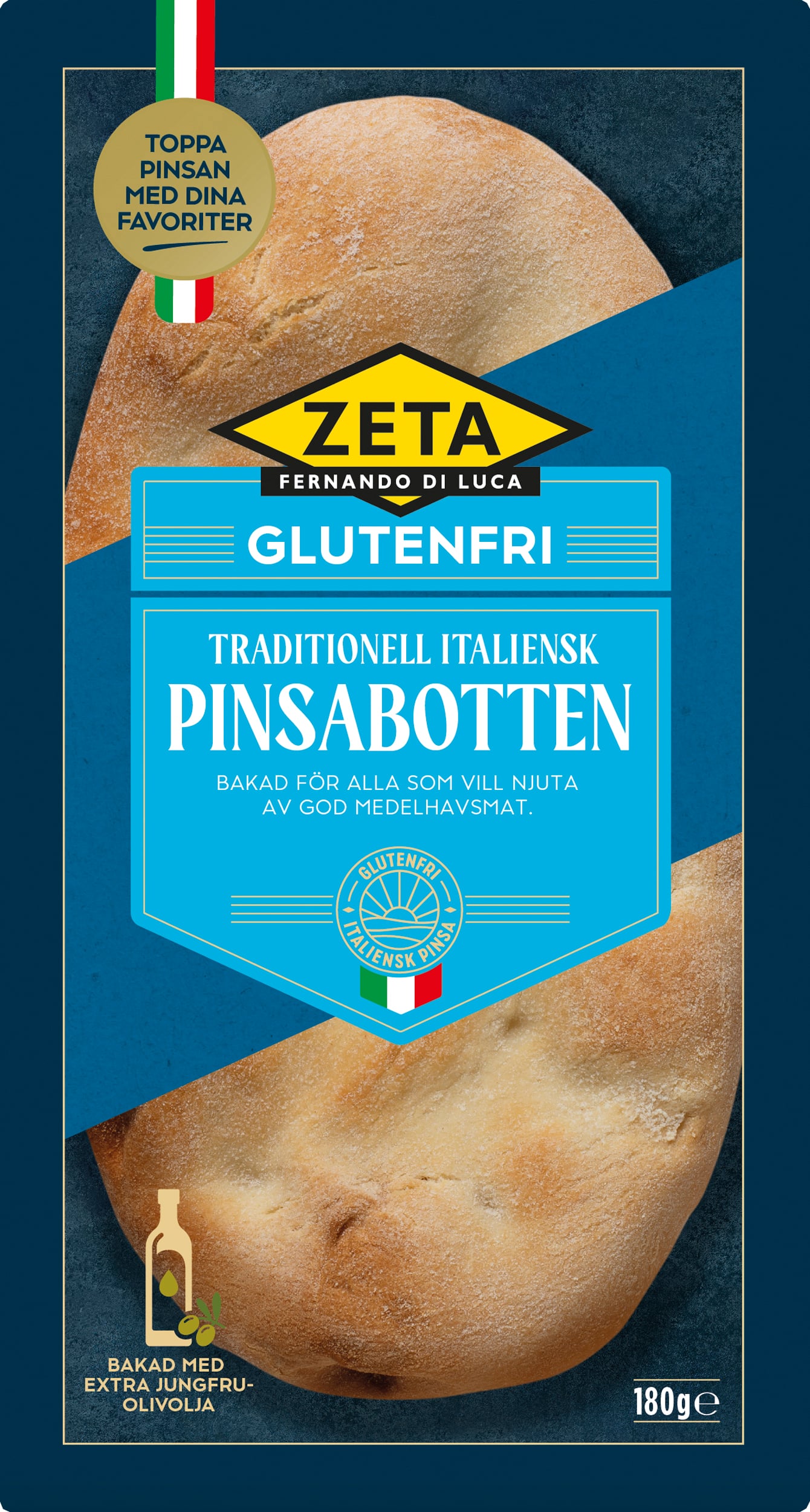 Zeta Pinsabotten Glutenfri är en pinsa bakad på majsmjöl samt ris- och majsstärkelse och vegetabiliska fibrer av bland annat ärta, ris och potatis. Även kallpressad olivolja Extra Vergine ingår. Pinsa kan närmast beskrivas som en blandning av focaccia och pizza. Den har en härligt seg konsistens och en fin fyllig brödsmak. Pinsabotten är fryst och blir bäst om man tinar den 10 minuter innan den gräddas. Den kan toppas med alla de klassiska ingredienserna som en pizza.
