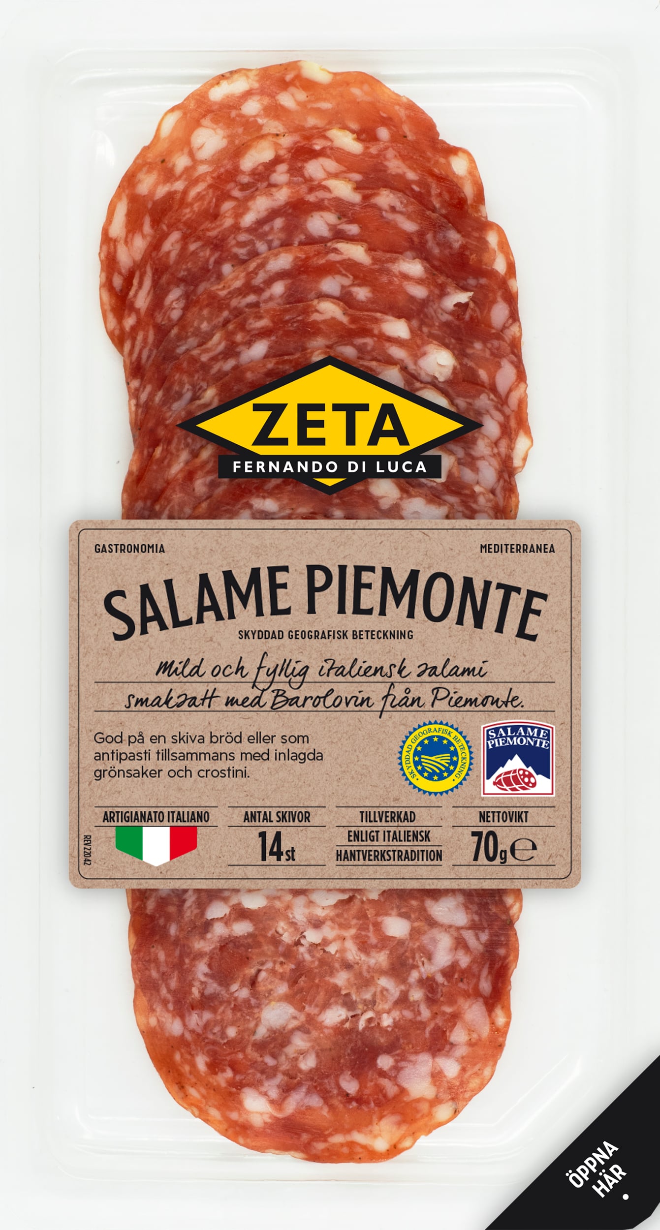 En smakrik salami med ursprung i regionen Piemonte i nordvästra Italien. Den är smaksatt med det typiskt piemontesiska rödvinet Barolo gjort på nebbiolodruvan. Detta ger Salame Piemonte en len men distinkt smak av med fruktig och pepprig karaktär. IGP-märkningen (Skyddad geografisk beteckning) garanterar ursprung och hantverksmässig tillverkning. Självklar på charkbrickan och som aperitivo gärna tillsamman med inlagda grönsaker och oliver, men också i sallader, pastarätten eller på pizzan.