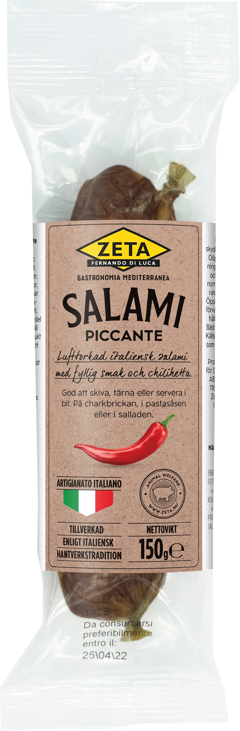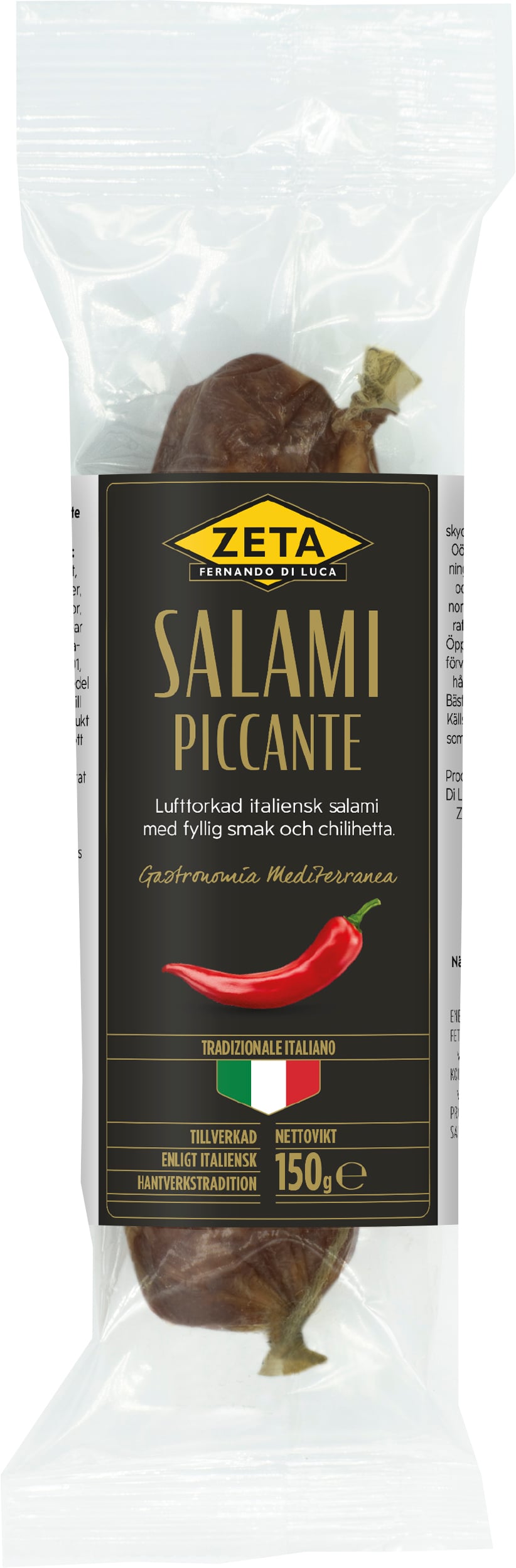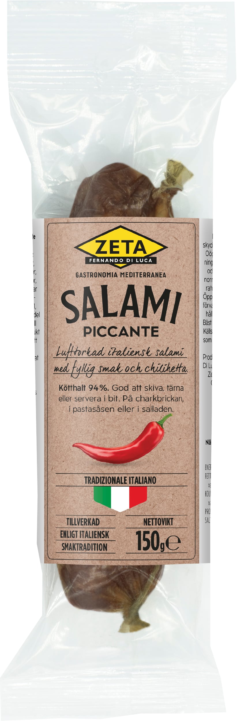 | Ingredienser | Fläskkött*, salt, aromer, dextros, kryddor, vitlök, chilipeppar 0,5%, antioxidationsmedel E301, konserveringsmedel (E252, E250). Till 100g färdig produkt har 157g fläskkött använts. *Fött, uppfött och slaktat i Italien. Skinnet är inte ätbart. Avlägsnas före förtäring. |