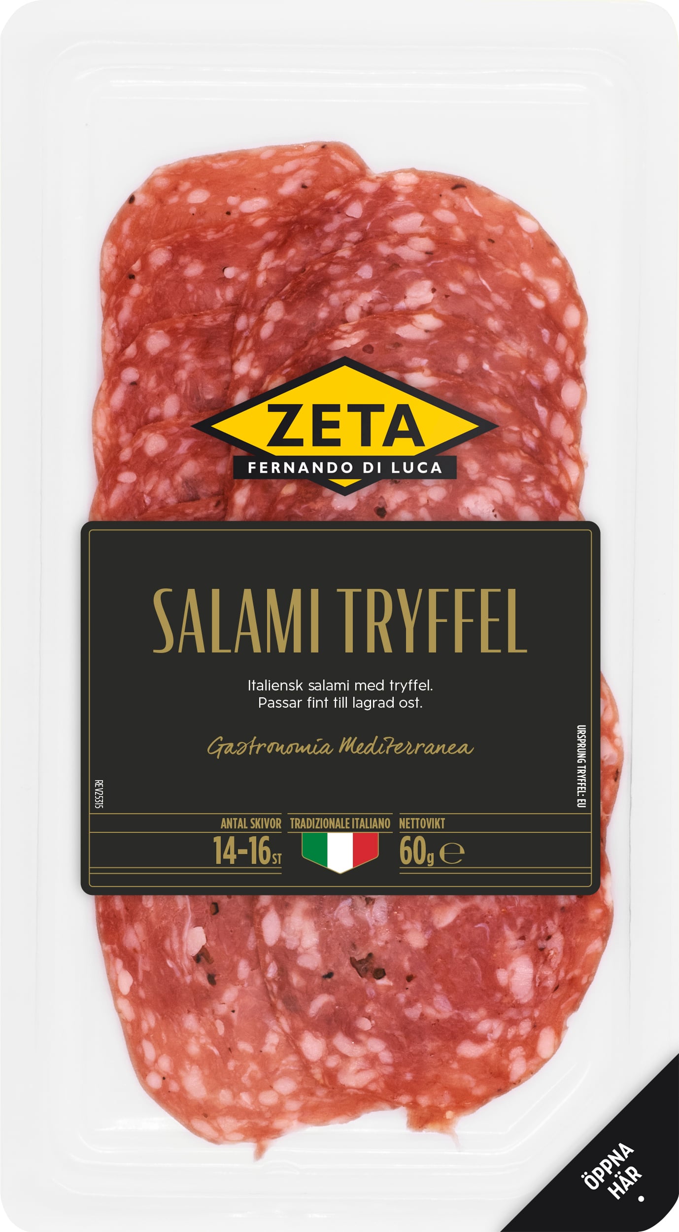 Zeta Salami med tryffel är en Italiensk salami med 2 procent tryffel som tillverkats enligt italiensk hantverkstradition. Salamin har kryddats varsamt, smaksatts med tryffel och lufttorkats. Smaken är välbalanserad med en fin sälta och tydlig smak av tryffel. Perfekt till antipastibrickan, som topping till färdiggräddad pizza, tunt strimlad över nykokt pasta eller som pålägg till surdegsbrödet med en fruktig och fräsch olivolja.