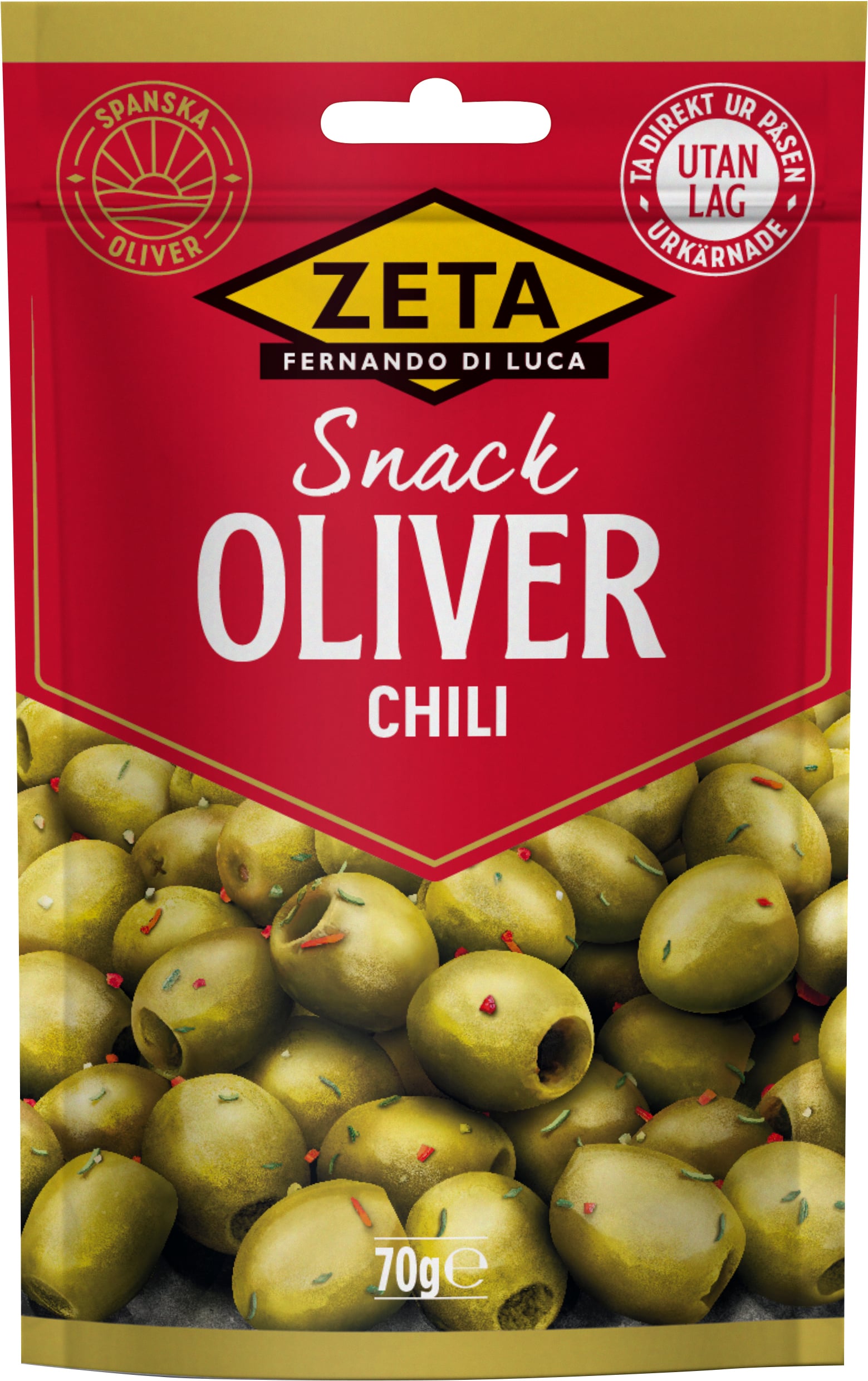 Mjälla, fylliga manzanillaoliver från Spanien packade i skyddande atmosfär, tillsammans med chili och lite olivolja. Eftersom de inte ligger i vattenlag håller de sig lika fasta i köttet som oliver med kärnor. Oliverna är suveräna på en antipastibricka med crostini och charkuterier. De är också goda i sallader och varmrätter som pizza, grytor, gratänger och mycket annat. Oliverna är maskinellt urkärnade. Någon kärna eller rest av kärna kan finnas kvar.