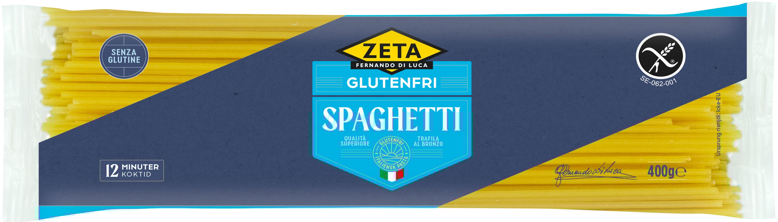 Zeta Glutenfri Spaghetti är bakad på mjöl av råris och vitt ris, majsmjöl och potatisstärkelse. Spaghettin smakar väldigt likt vanlig pasta och har fina kokegenskaper, kokar inte sönder och har bra al dente-känsla. Spaghetti är en pastaform som har sitt traditionella ursprung i södra Italien, ordet betyder snören. Serveras oftast med grönsaker och tomatbaserade såser, gärna med fisk och skaldjur.