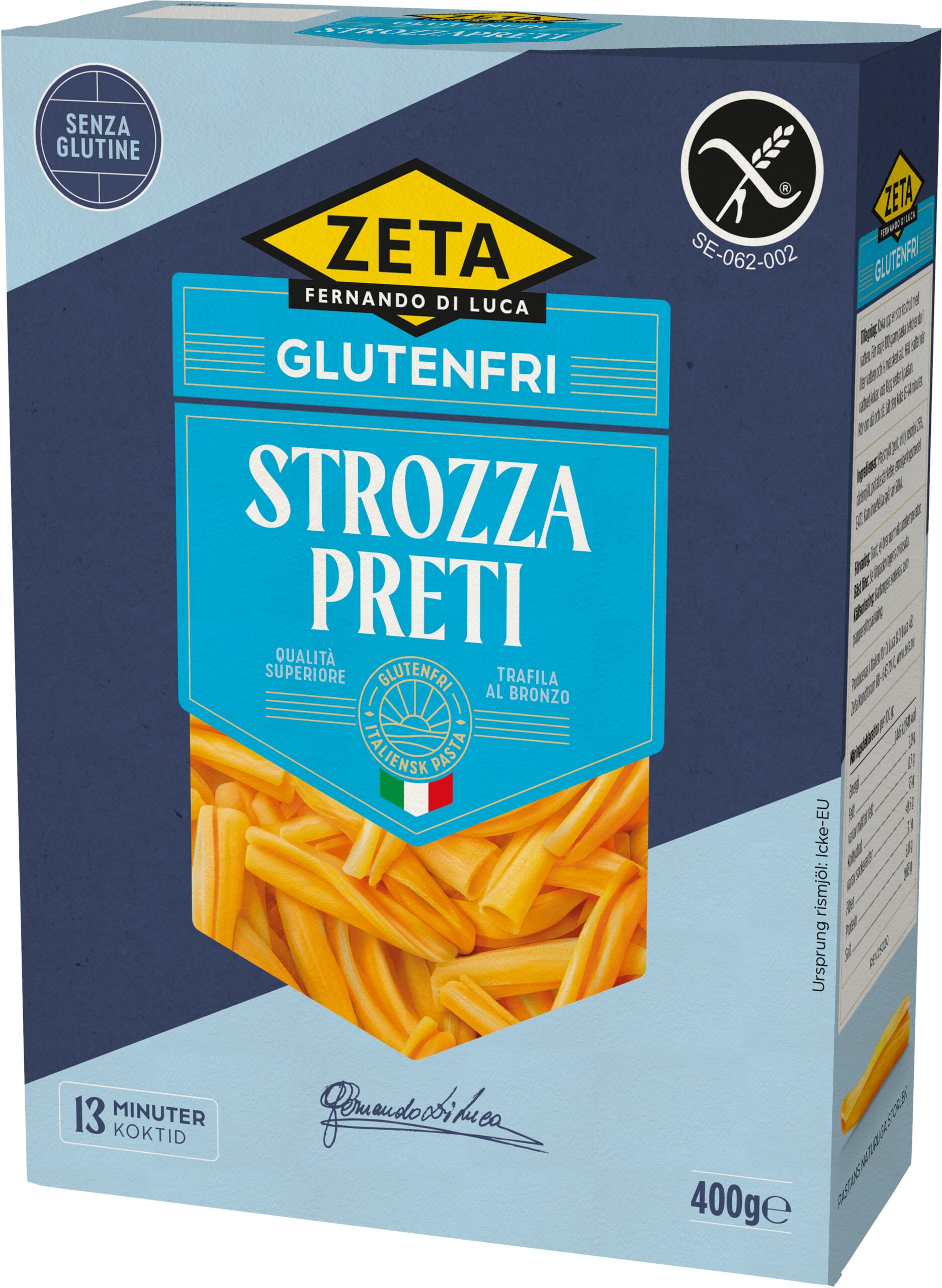 Zeta Glutenfri Strozzapreti är bakad på mjöl av råris och vitt ris, majsmjöl och potatisstärkelse. Pastan smakar väldigt likt vanlig pasta och har fina kokegenskaper, kokar inte sönder och har bra al dente-känsla. Den är valsad så den har en ojämn yta, vilket gör att den absorberar smaker bättre. Strozzapreti passar väldigt bra ihop med släta, fylliga såser alternativt med små bitar i. Mycket god med grönsakssåser, men även till kött och kyckling och skaldjur.