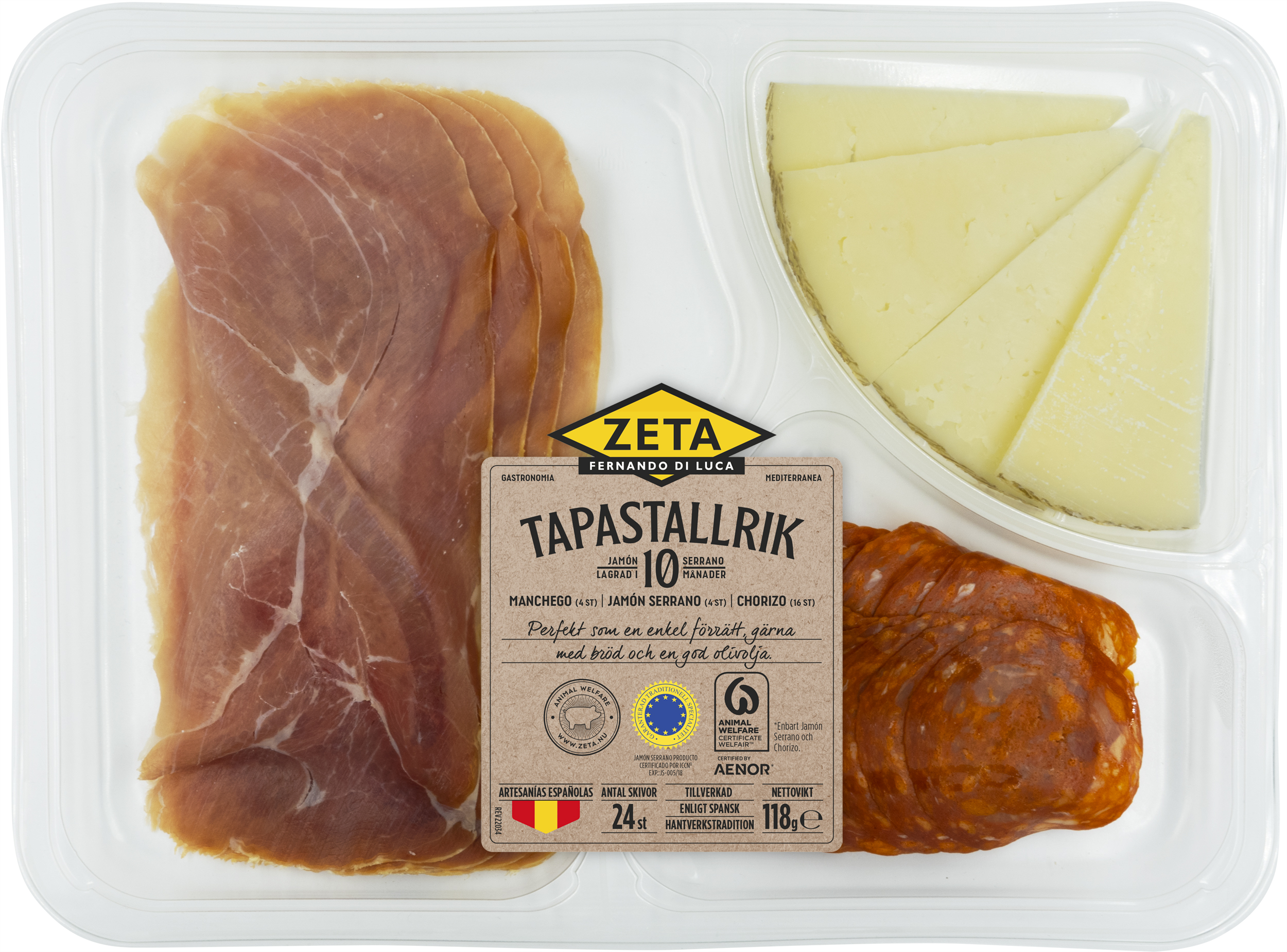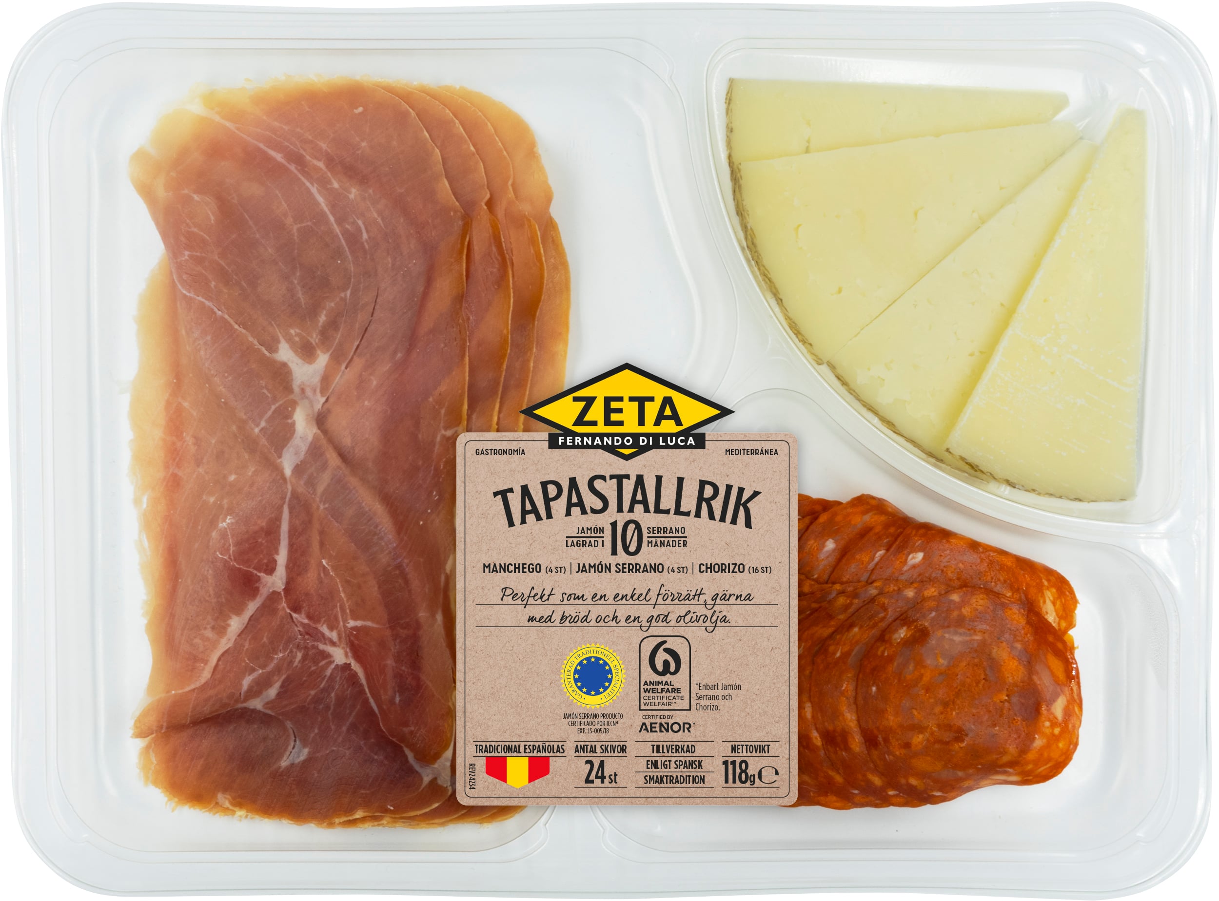 | Ingredienser | Serranoskinka 41% (Skinka av gris*, salt. Till 100 g färdig produkt har 145 g kött använts.) Manchego-OST 34% (pastöriserad fårMJÖLK*, salt, löpe, syrningskultur, stabiliseringsmedel E509). Ostens kant skall inte ätas. Chorizo 25% (Kött och fett av gris*, salt, paprikapulver, dextros, vitlök, kryddor (muskotnöt, oregano), antioxidationsmedel E301, konserveringsmedel E250 och E252. Till 100 g färdig produkt har 138 g kött använts.) *Fött, uppfött och slaktat i Spanien. |