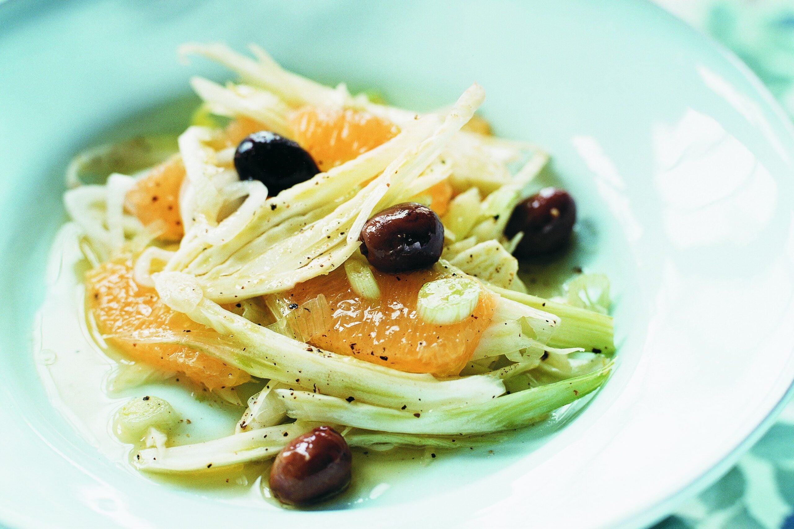Apelsin- och fänkålssallad med svarta oliver och mangovinägrett. En sallad med spännande smaker. Perfekt som förrätt eller tillbehör.