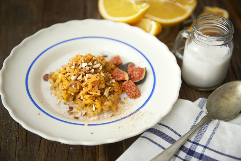 Porridge all’arancia e mandorle. Ljuvligt god kanel- och apelsindoftande gröt med naturlig sötma från morötter.