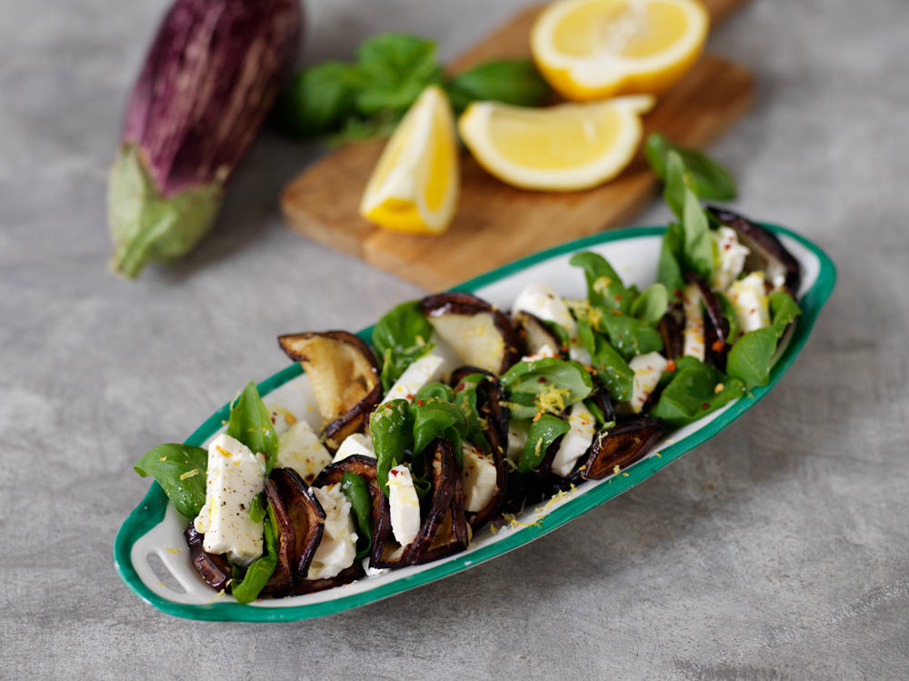Vegetariskt tilltugg med aubergine fylld med krämig fetaost och färsk basilika. Imponera på dina gäster genom att servera på buffébordet eller som småplock till drinken.