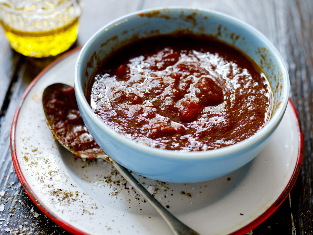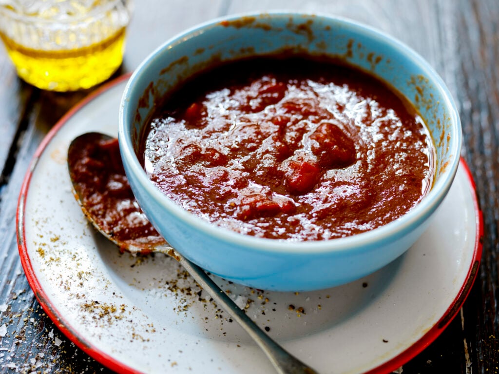 BBQ-sås med vitlök, ingefära, tomatpure, muscovadosocker och och rödvinsvinäger. Bra till revbensspjäll, pulled pork, hamburgare eller att marinera nötkött i.