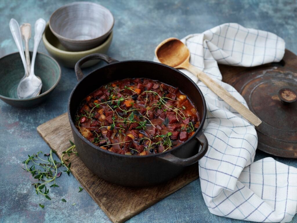 Mustig gryta med bönor och hetta från salsiccia med chili. Går att äta som den är eller tillsammans med kokt potatis eller ris.