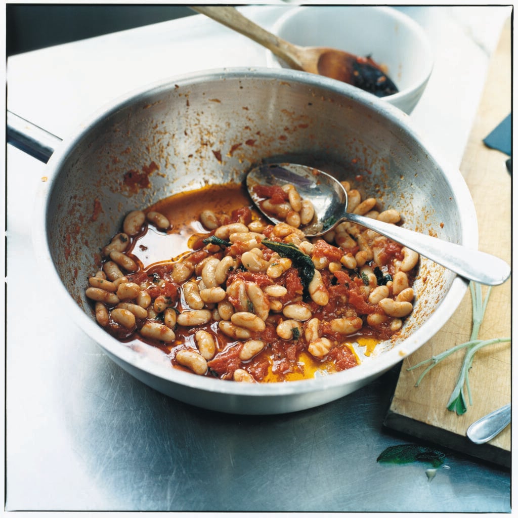 Den här vegetariska böngrytan får en lite pepprig smak från salvia. Om du vill servera den med kött så passar det utmärkt med stekt bogfläsk till.