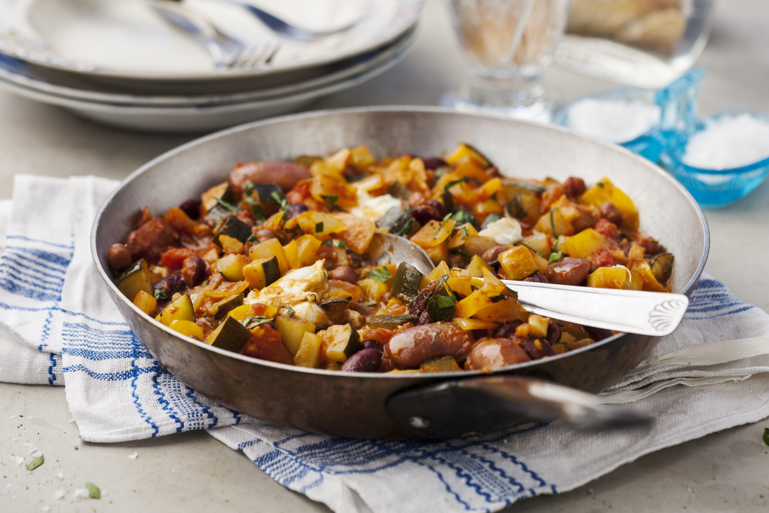 Ratatouille är en klassisk bön- och grönsaksröra. I det här receptet med mättande bönor och smält mozzarella.