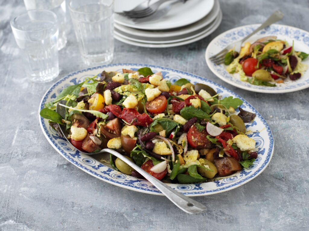 En snabb och god bönsallad som passar som tillbehör, till en lunch eller som en del av en buffé. Krispigt, härligt och välsmakande med oliver, bönor och grillad paprika.