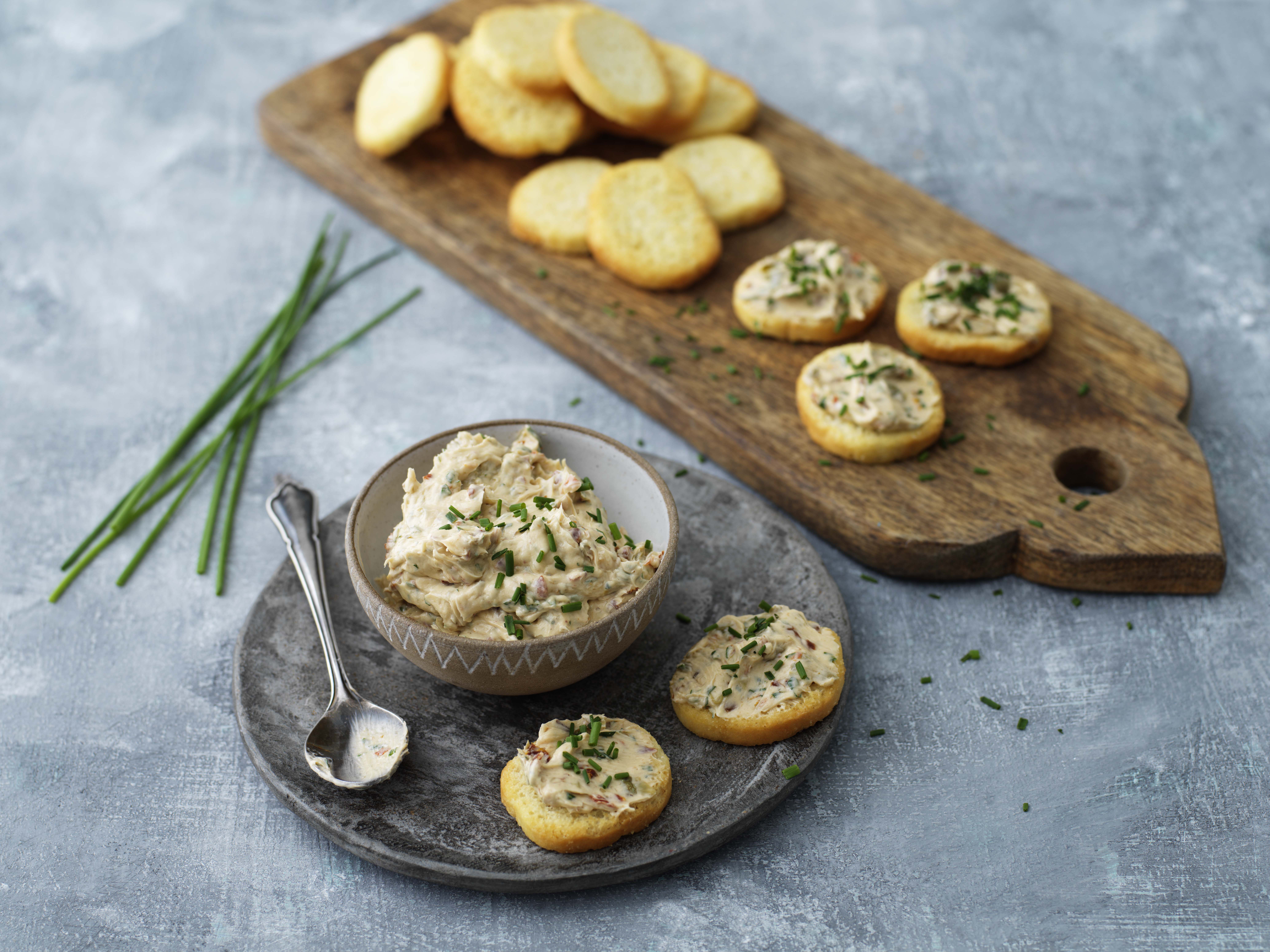 Crostini bredd med en röra på BreOliv smaksatt med kapris, soltorkade tomater och sardellcrème är ett perfekt tilltugg på buffén eller innan maten.