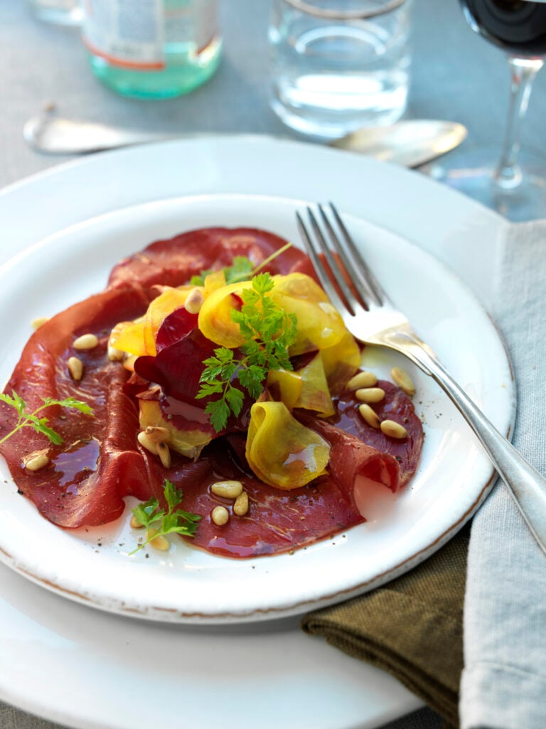 Bresola med tunt skivade betor, rostade pinjenötter och färska örter. Utmärkt att bjuda på som förrätt.