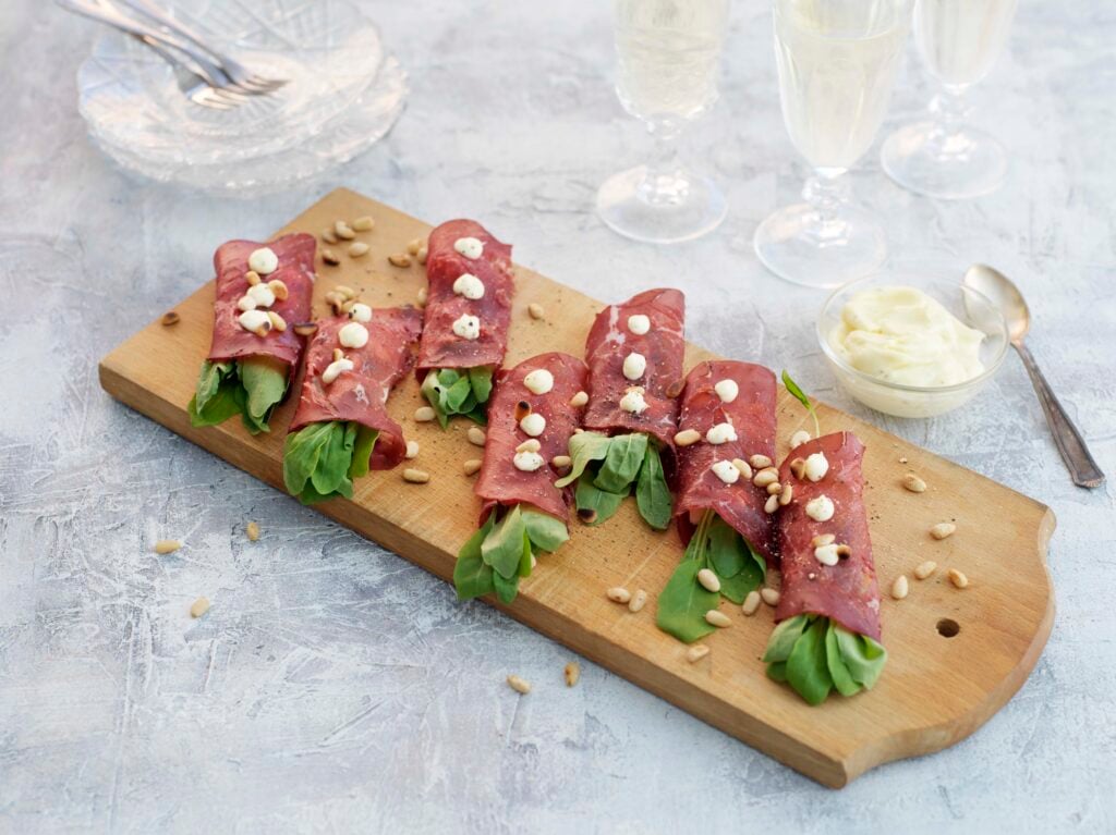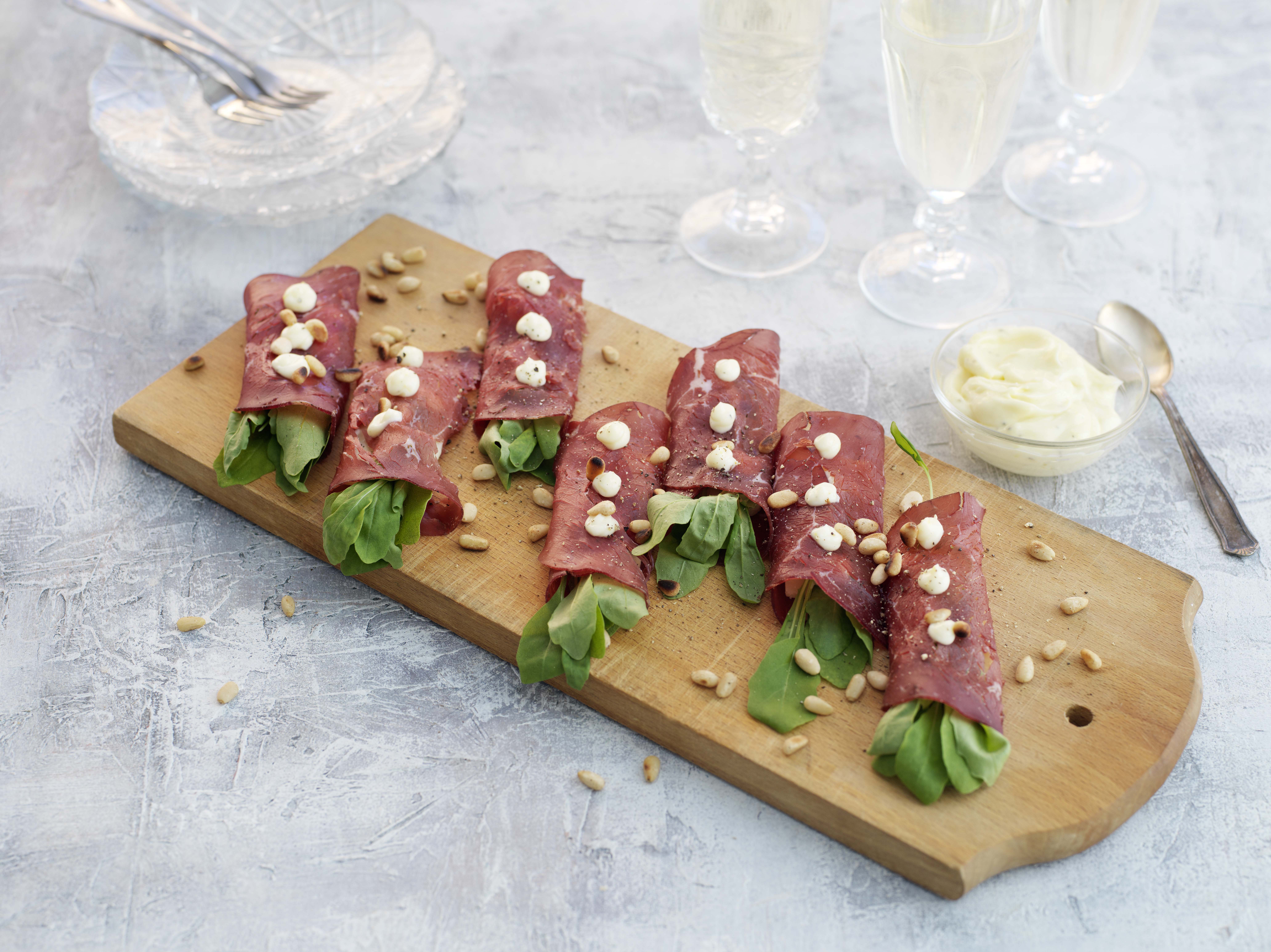 Bresaolarullar med parmesan, rucola, citronmajonnäs och rostade pinjenötter är snabba och smakrika tilltugg, perfekt till drinken eller på buffén.