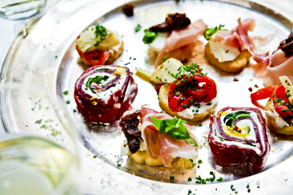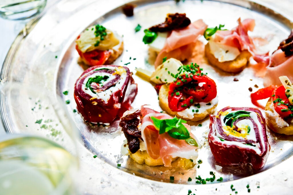 Perfekt att förbereda dagen innan festen och skära upp till servering. På brickan serveras även Crostini med olika toppings som kronärtskockor, Prosciutto Di Parma, soltorkade tomater och mascarpone.