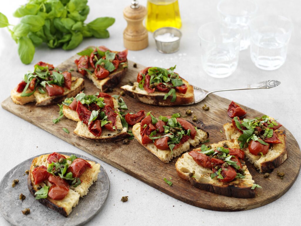 En smakrik bruschetta med ugnsbakade tomatklyftor tillsammans med smakrik olivolja och friterad kapris blir perfekt som lite antipasti eller på buffébordet.