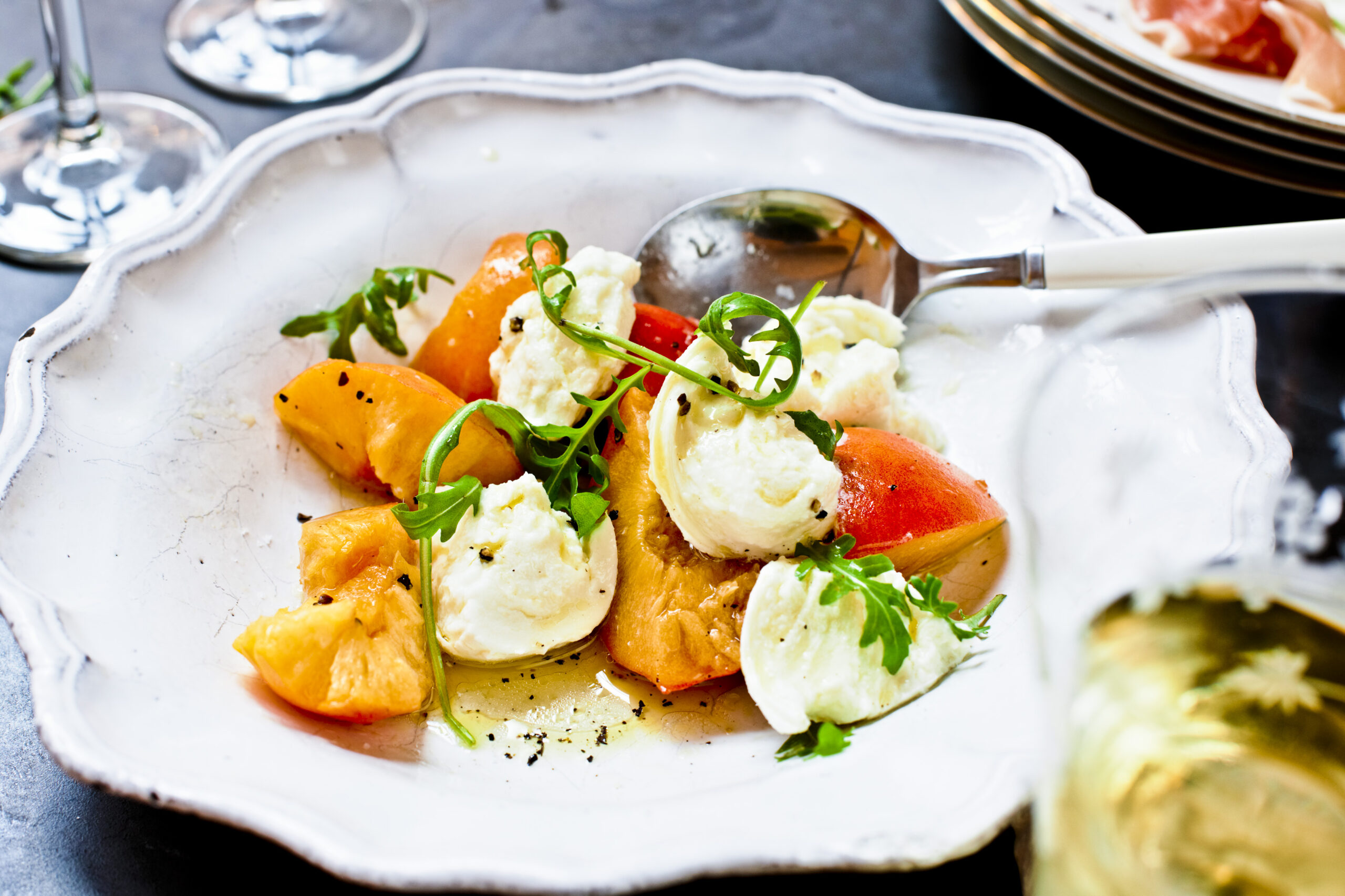 Krämig burrata med solmogna nektariner och kryddig ruccolasallad. En perfekt förrätt!
