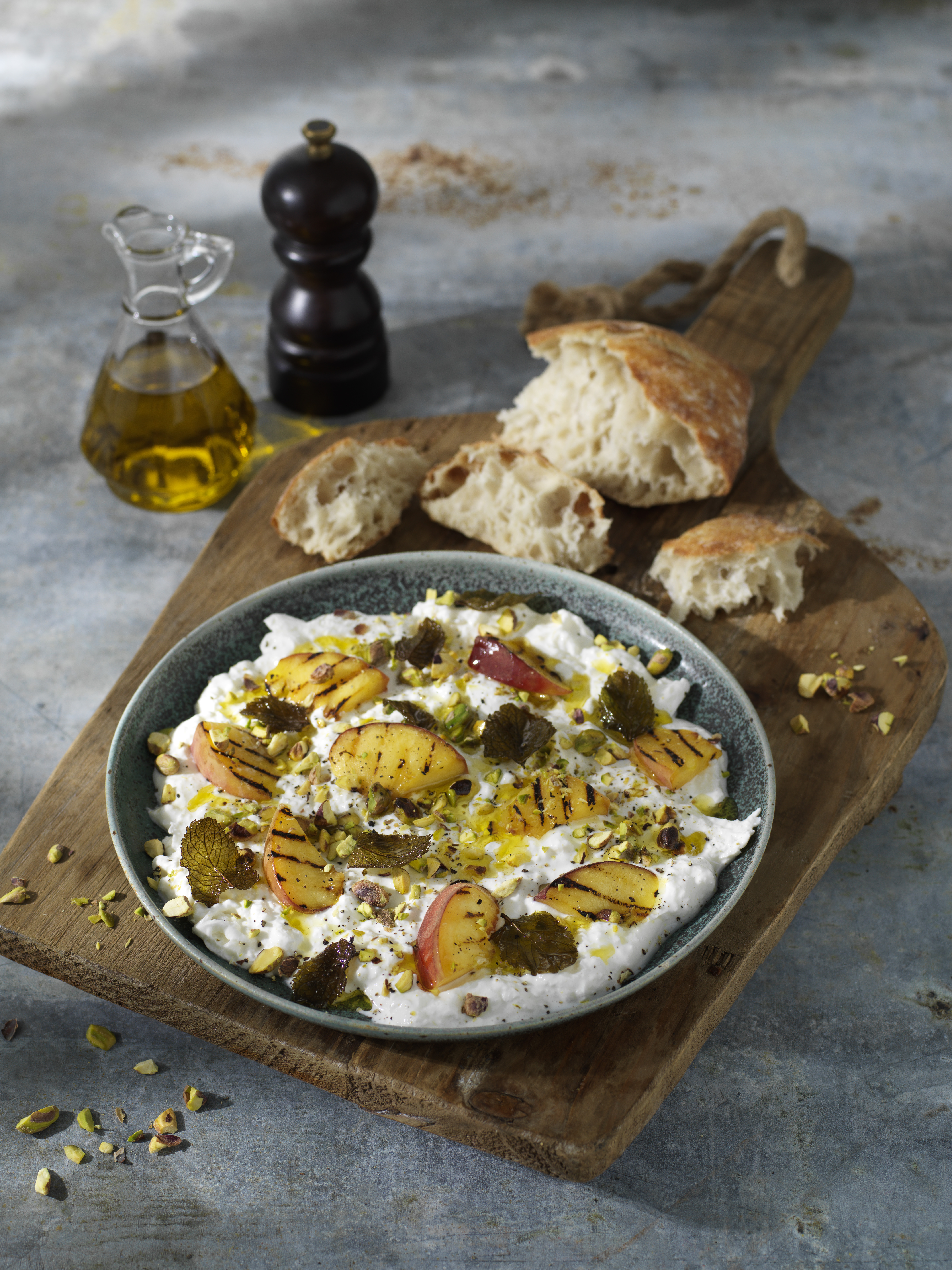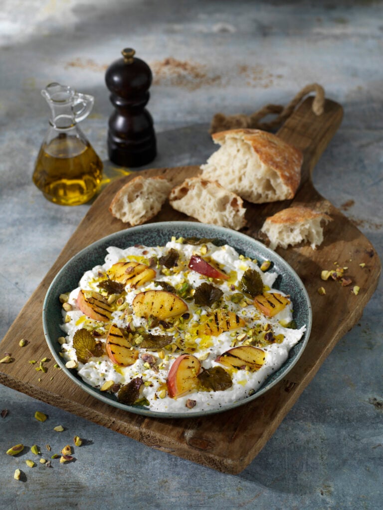 Burrataboard med persika och mynta