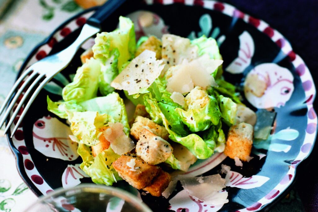 Caesarsalladen skapades första gången av den italiensk-mexikanske kocken Caesar Cardini, därav namnet. Han bodde i San Diego men drev restaurang i den mexikanska staden Tijuana. Den krispiga romansalladen och brödkrutonger med sin krämiga, smakrika dressing gjord på äggula, olivolja, parmesan, vitlök och sardeller har erövrat världen under de hundra år som gått sedan Caesar rörde ihop den allra första. Den är underbart god som den är eller tillsammans med kyckling eller räkor.