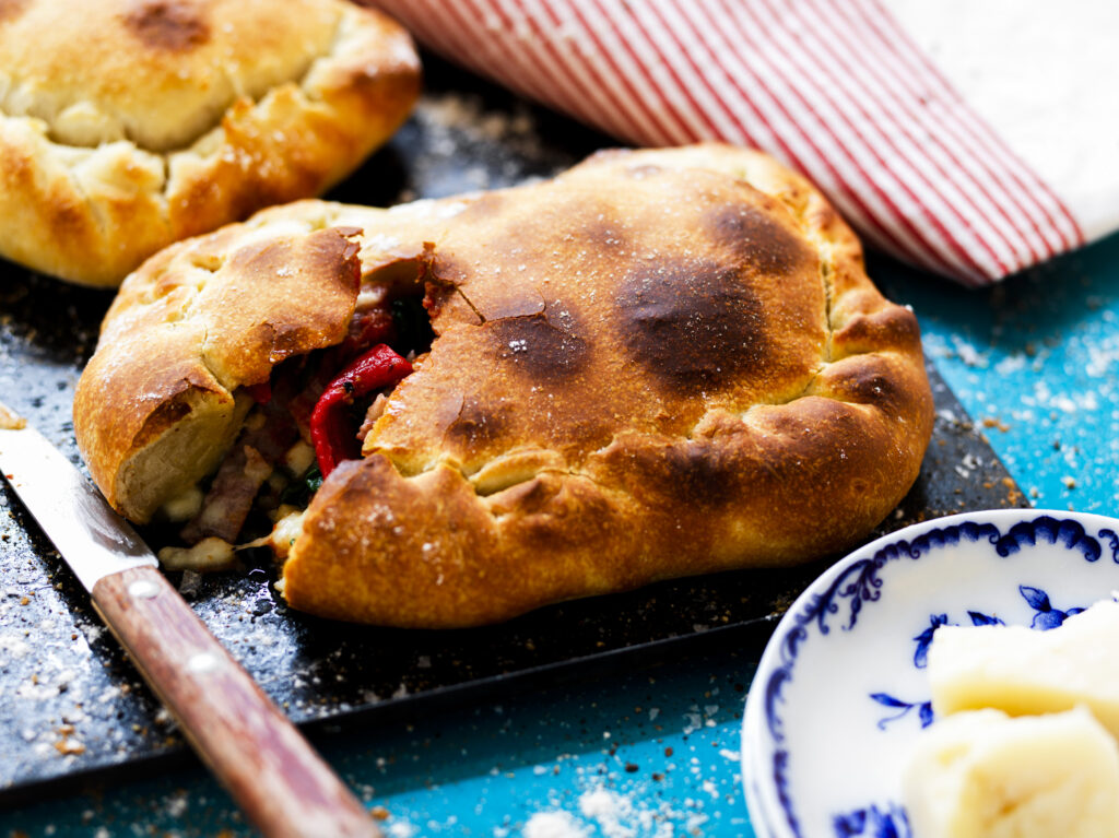 Calzonepirog med spenat och salami, grillade paprikor och krämig mozzarella. Perfekt för utflykten.