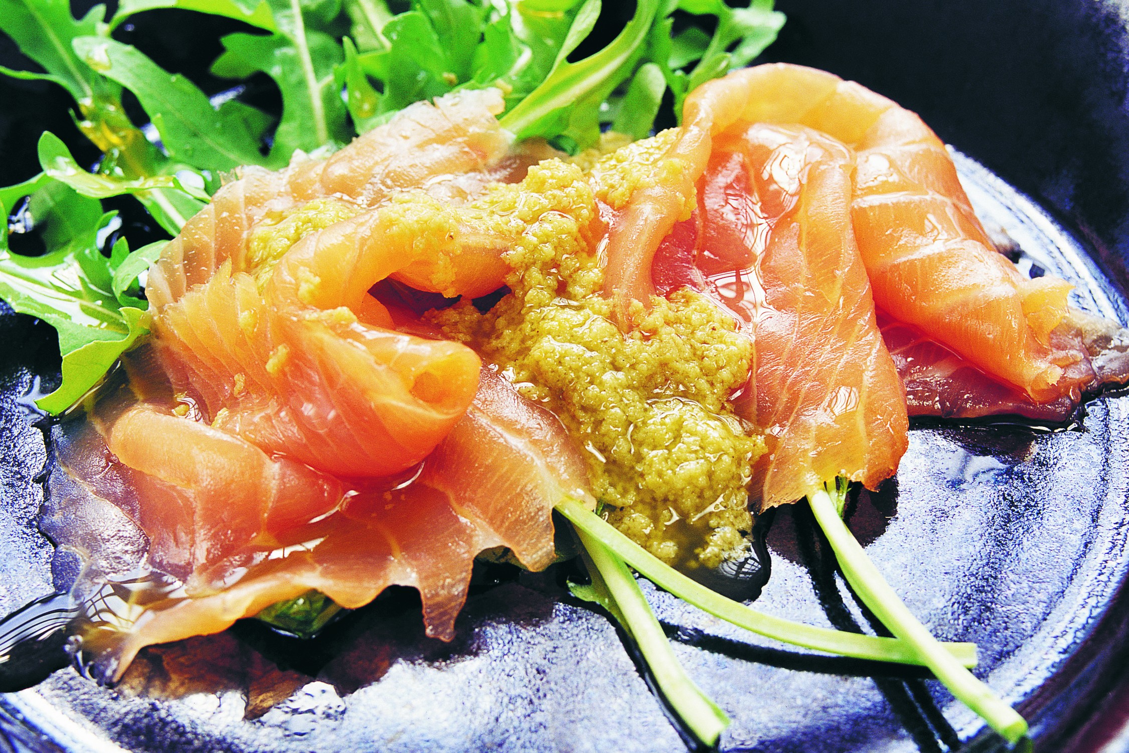 Tunnt skivad lax med en god vinägrett som smaksatts med creme av gröna oliver