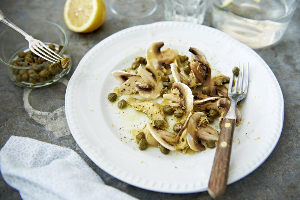 Enkel och lyxig sallad med champinjoner, kapris och kroärtskockor