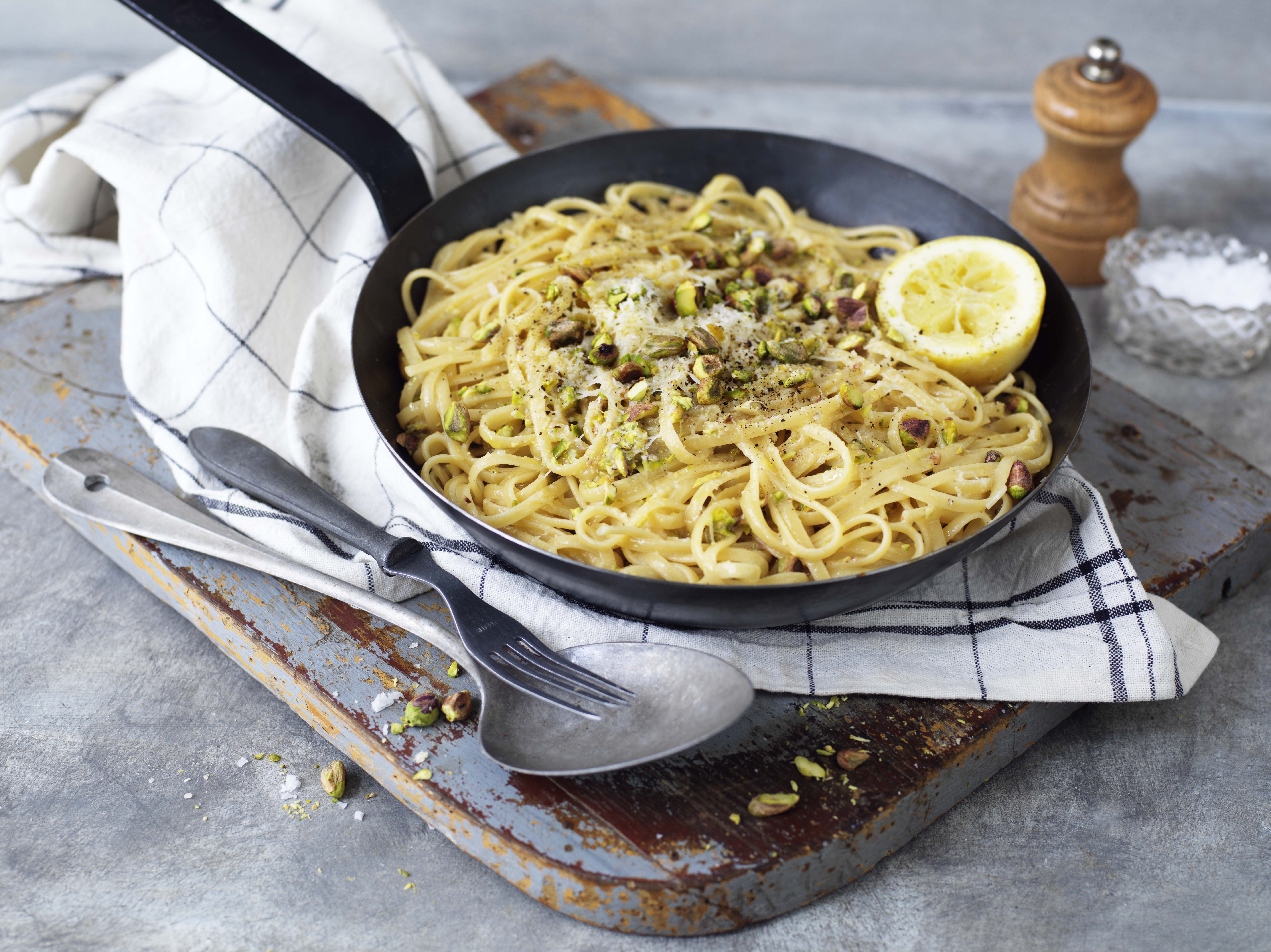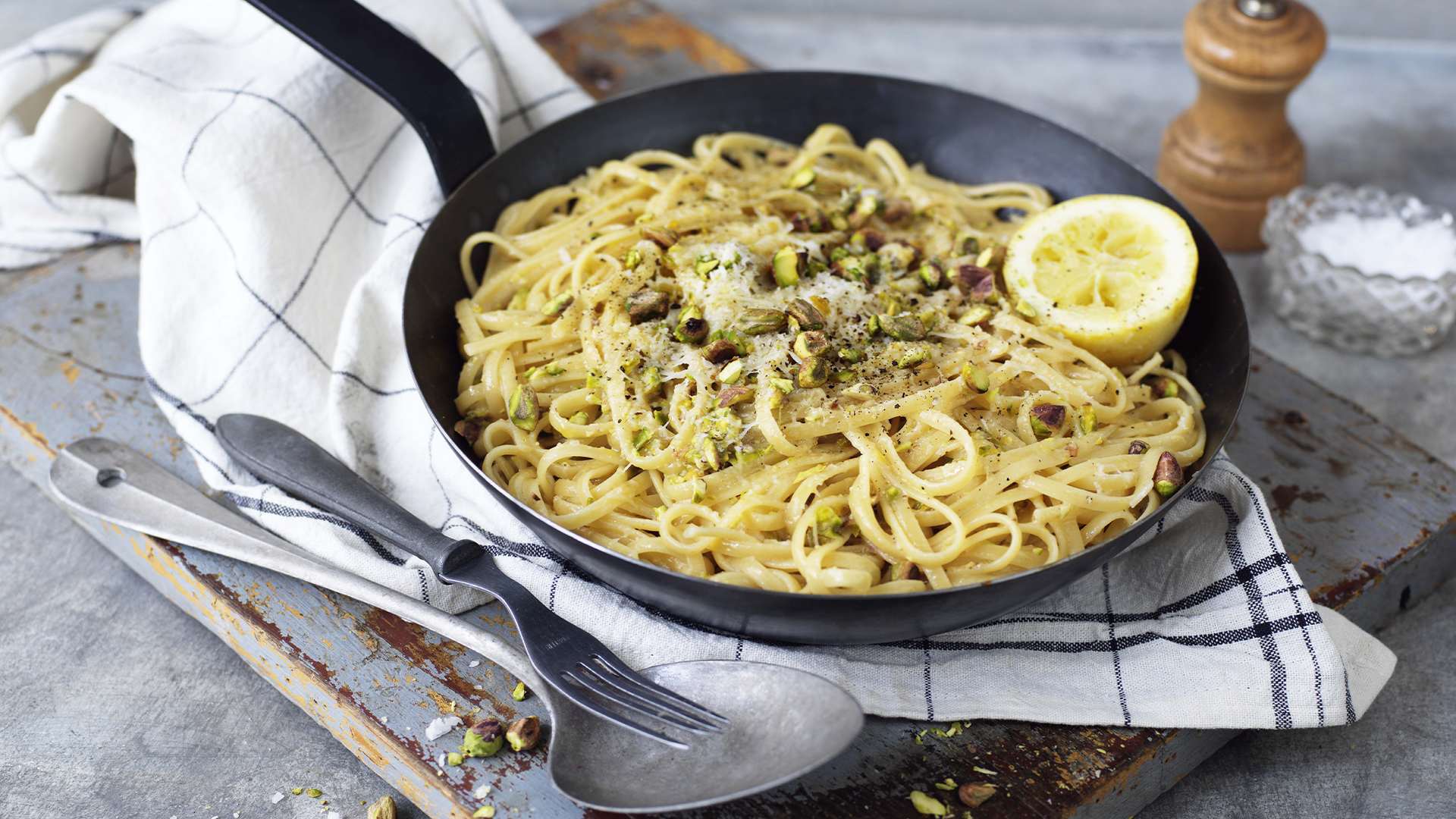 En fräsch och härligt smakrik pasta med få ingredienser och som går snabbt att laga till. Härliga smaker av citron, vitlök, parmesan och pistagenötter.