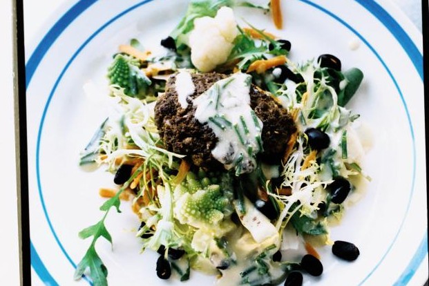 En variant på de klassiska färsbiffarna med en sallad på blomkål och bönor som toppas med en smakrik gorgonzoladressing.