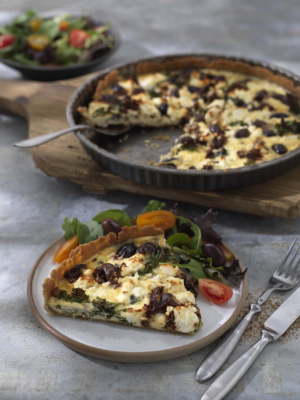 Fetaostpaj med oliver och soltorkade tomater, en smakrik paj med kalamataoliver, spenat, gönkål och fetaost och skal av fullkornsmjöl och olivolja.