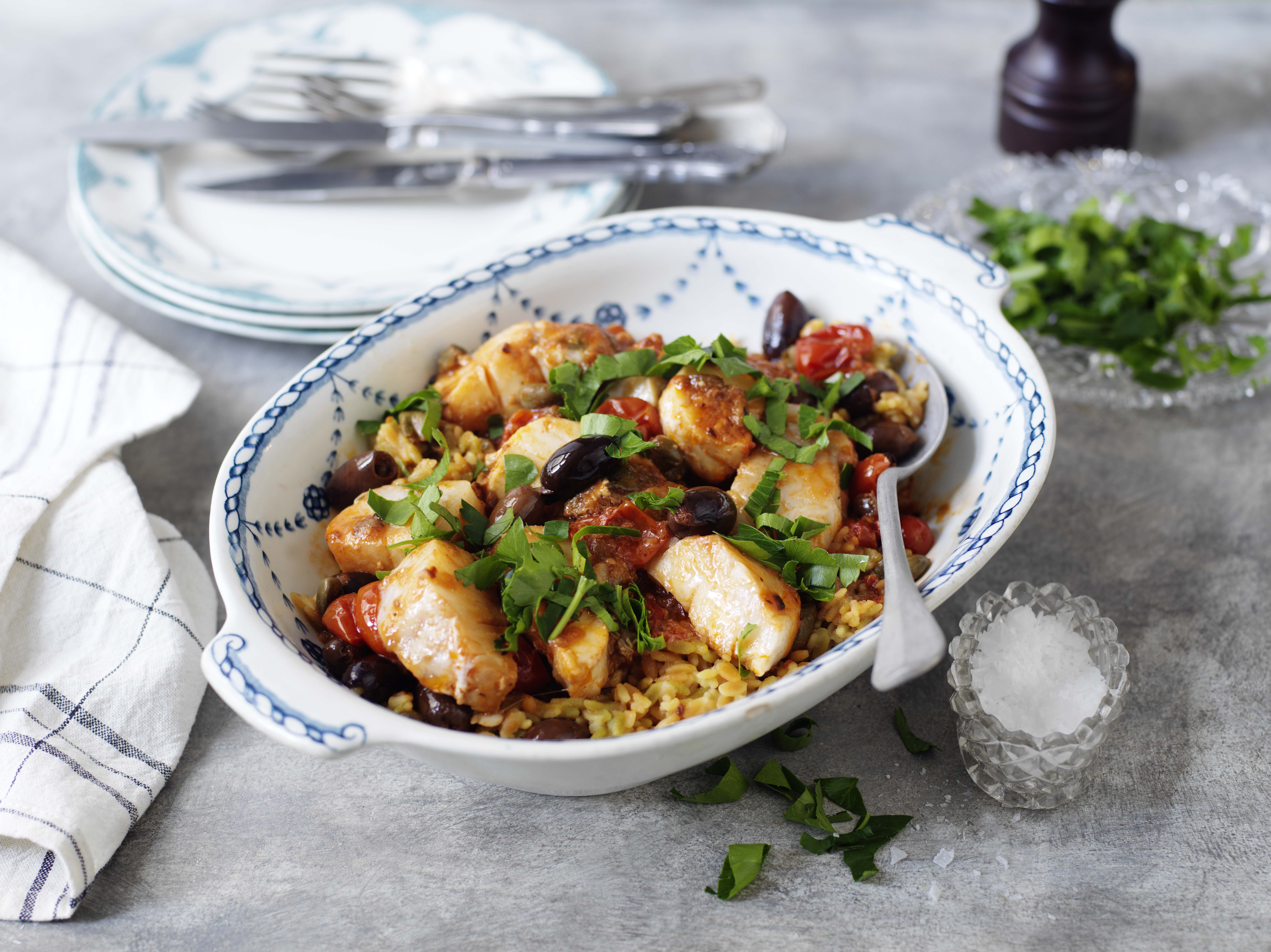 Variant på den klassiska rätten pasta puttanesca med fisk. En härlig fiskgryta med smak av tomater, kapris och oliver. Serveras tillsammans med risoni, en risformad pasta.